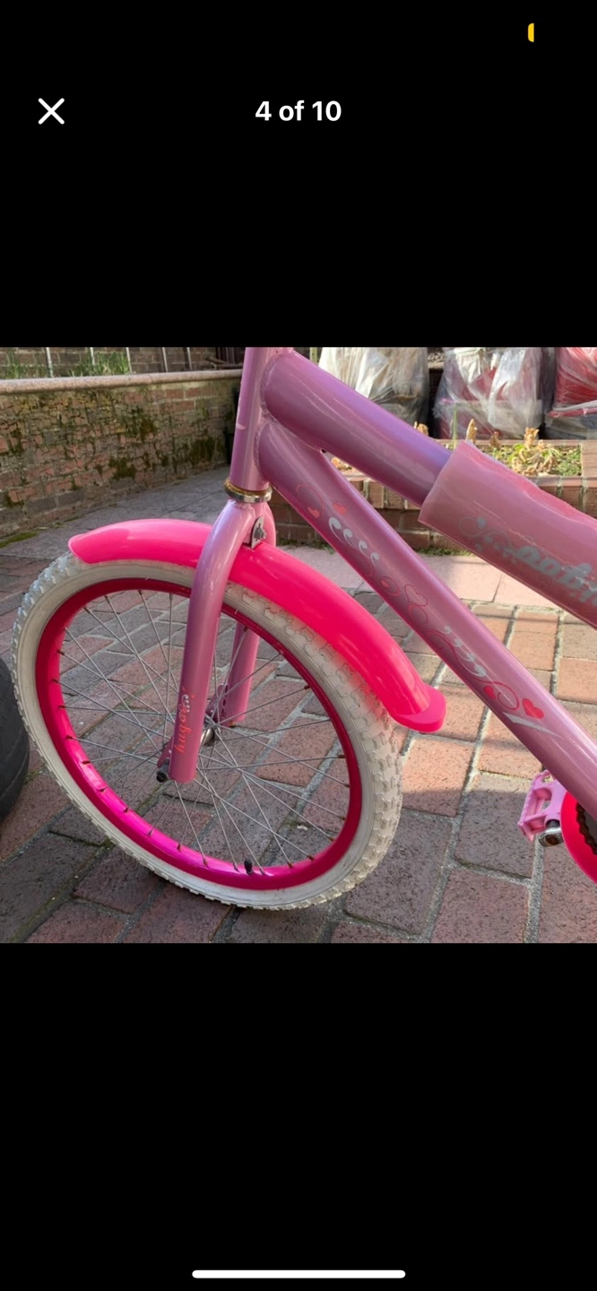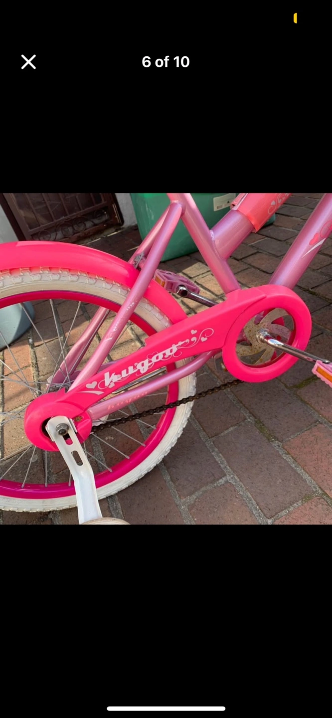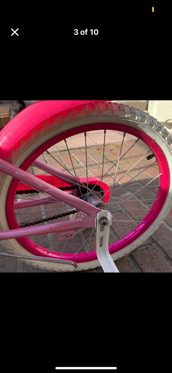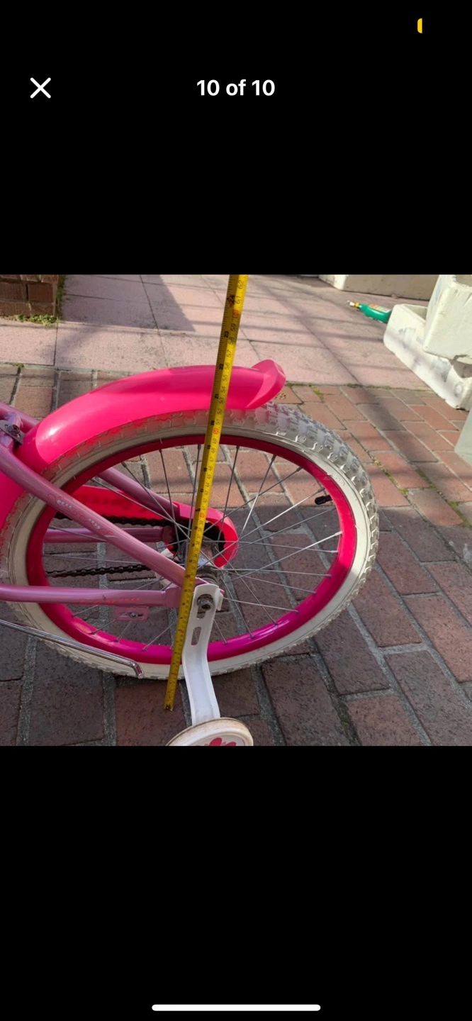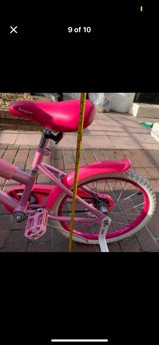 The bike still in usable condition maybe need small fixes and tires air. Used girls' bike. Pink and purple. 16 inch wheels. Includes training wheels. Good condition.