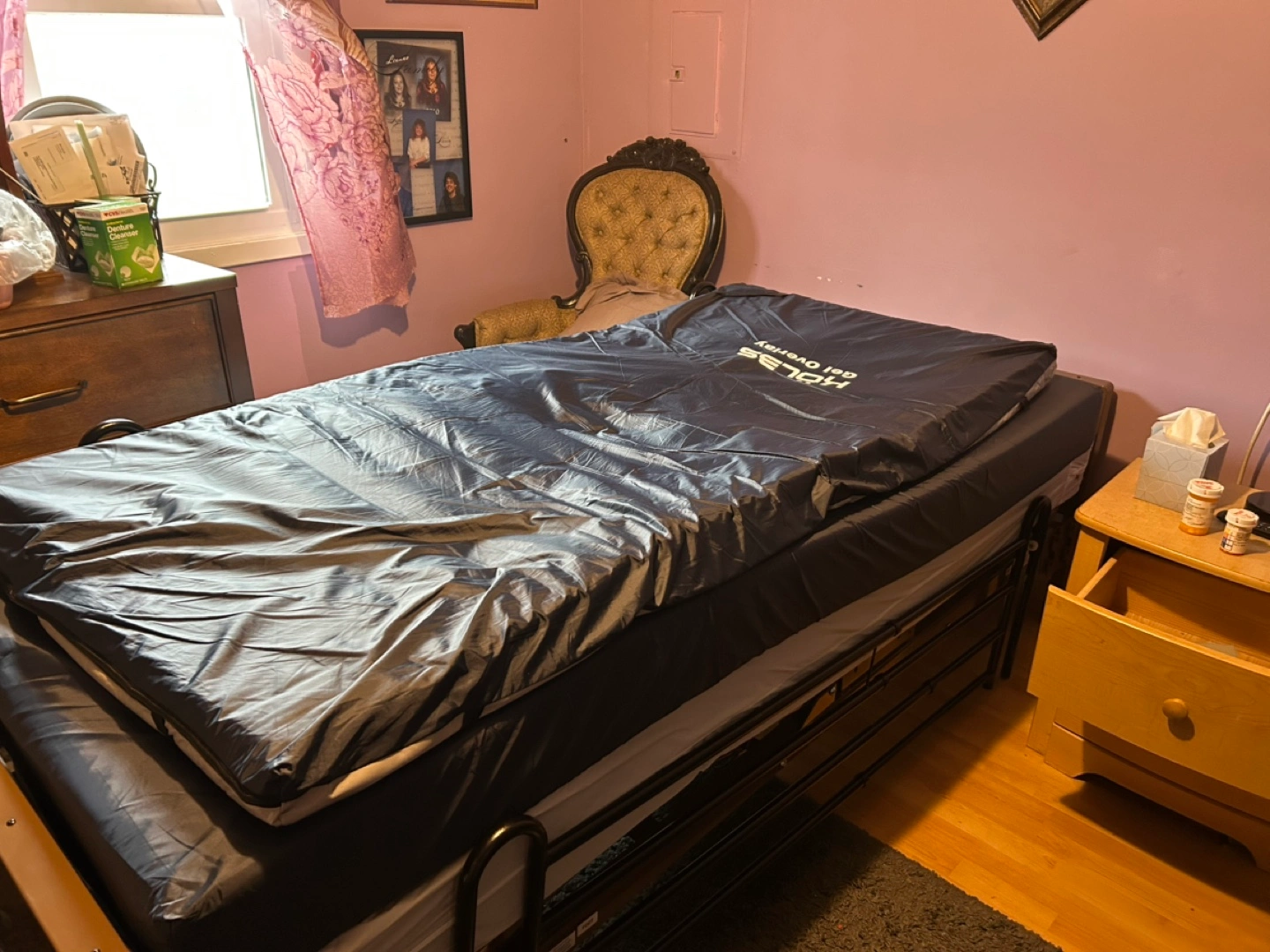 Hospital bed with overlay. Good condition. Metal frame. Easy to clean. Great for elderly care.