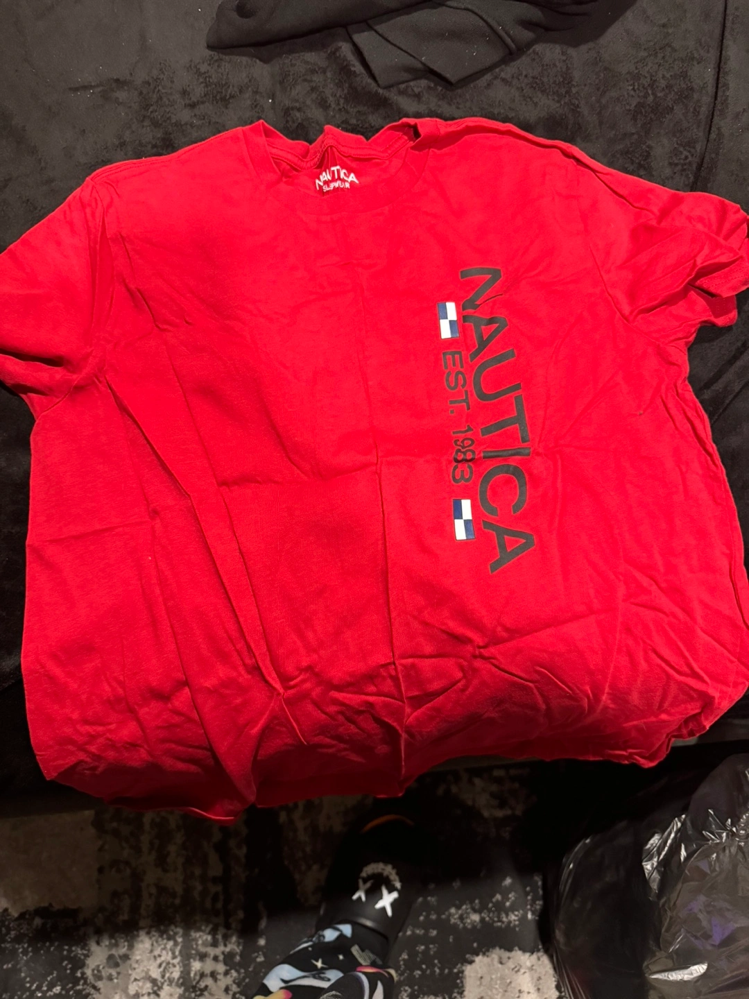 Men's red Nautica T-Shirt. Features brand logo and Est. 1983.
