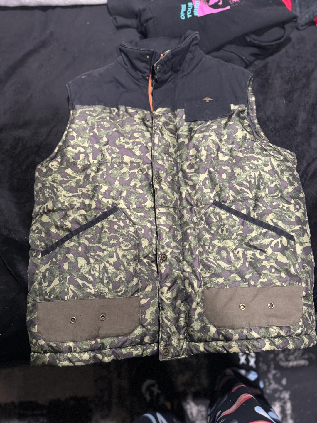 Lightly used men's vest. Camo print. Button closure. Two lower pockets. Black collar.