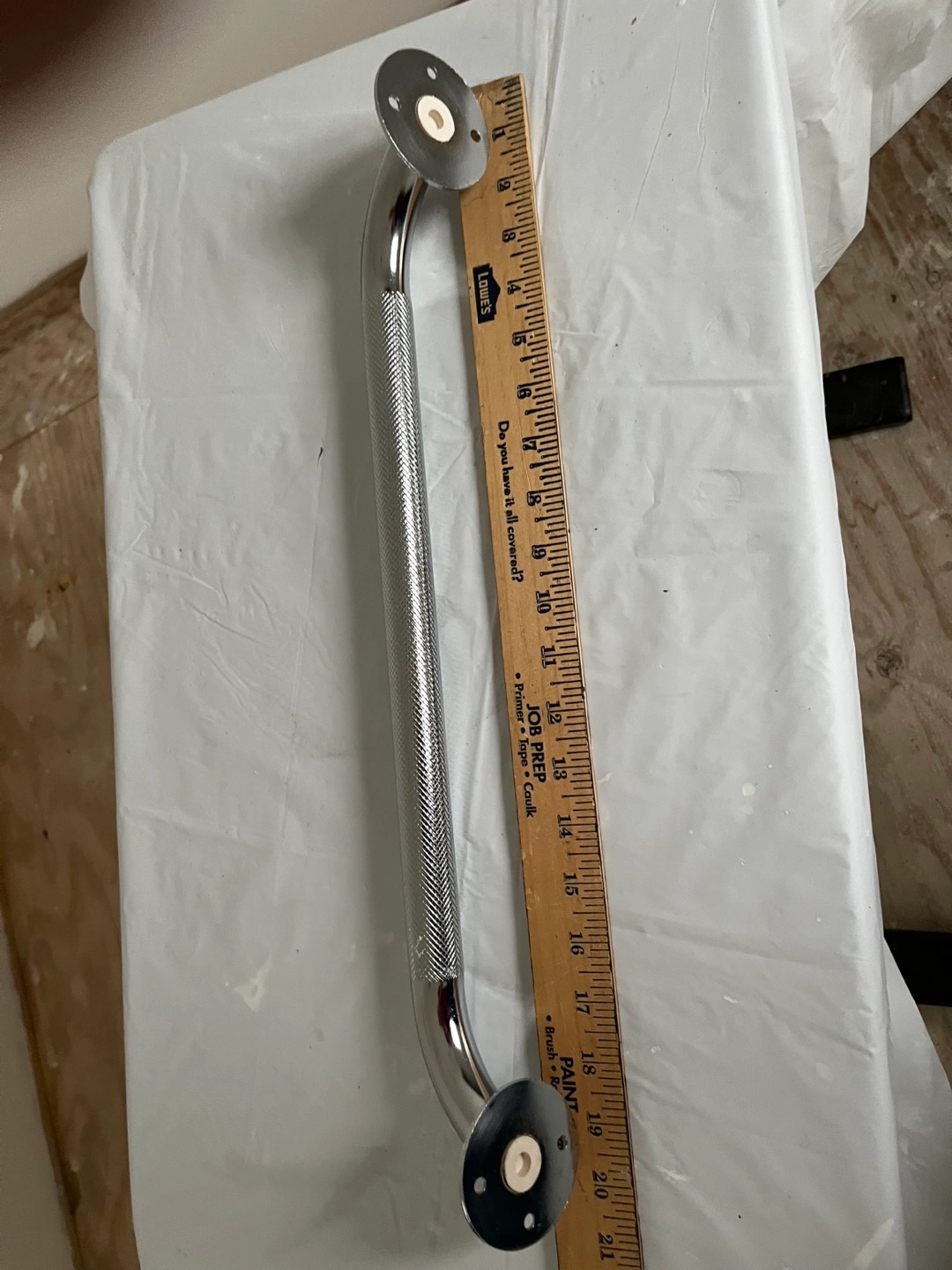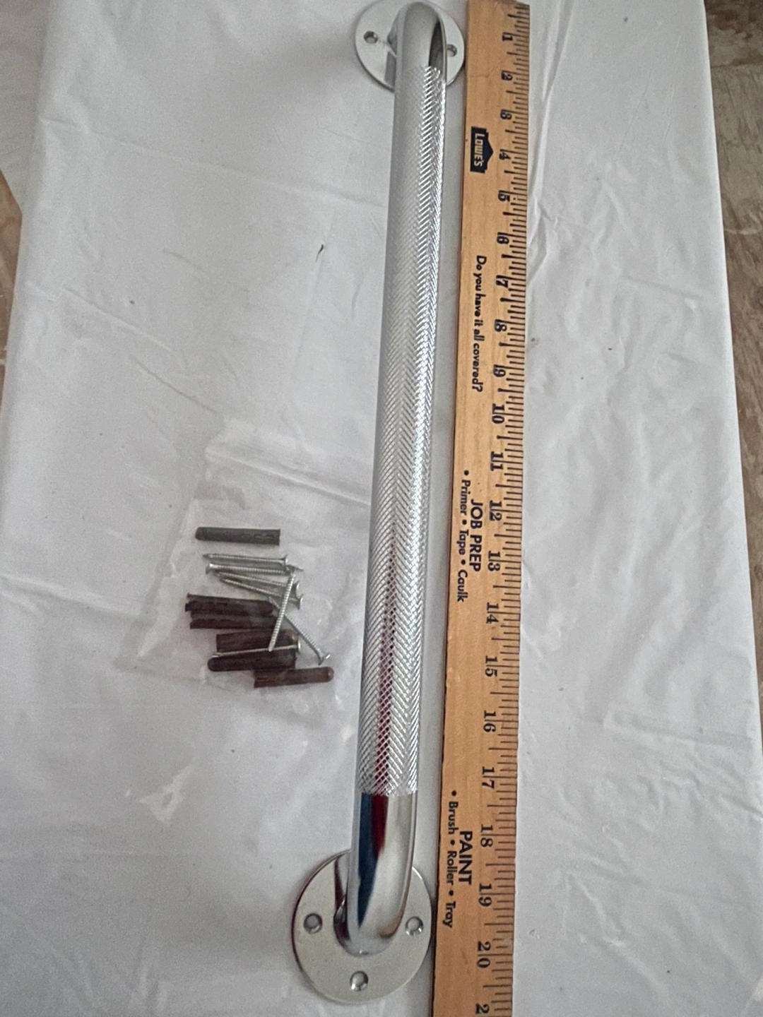 98Heavy Duty Chrome textured grab bar, for Bathtubs and Showers. Approximately 19 inches long, Bar 3” diameter. Includes mounting hardware: screws and wall anchors. Corrosion resistant Stainless Steel. Good condition.