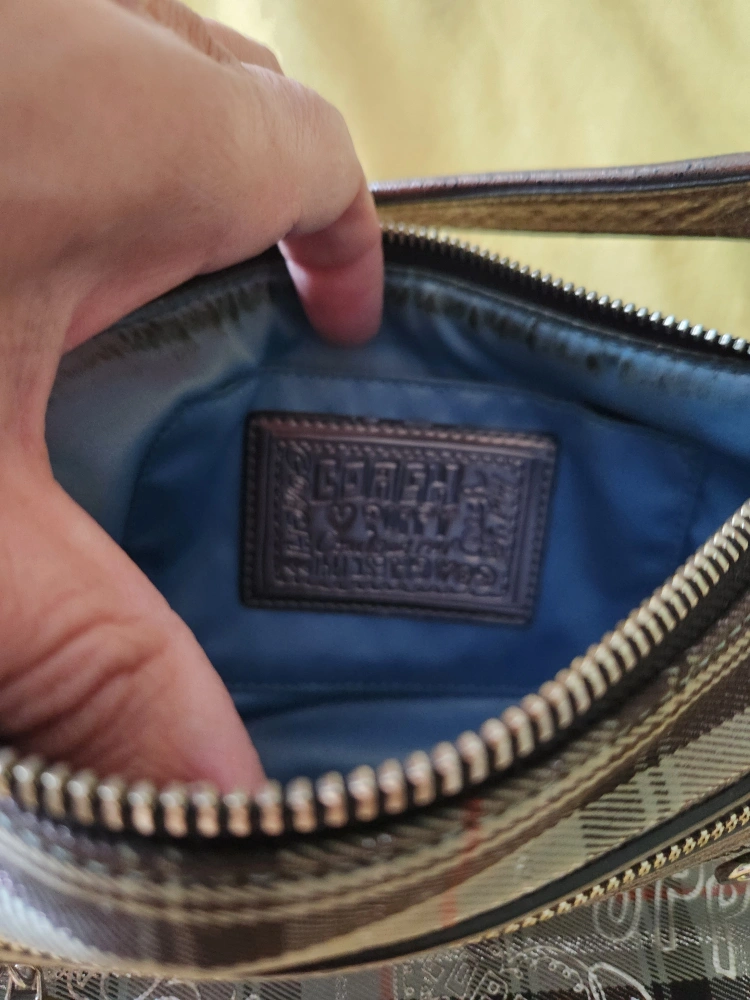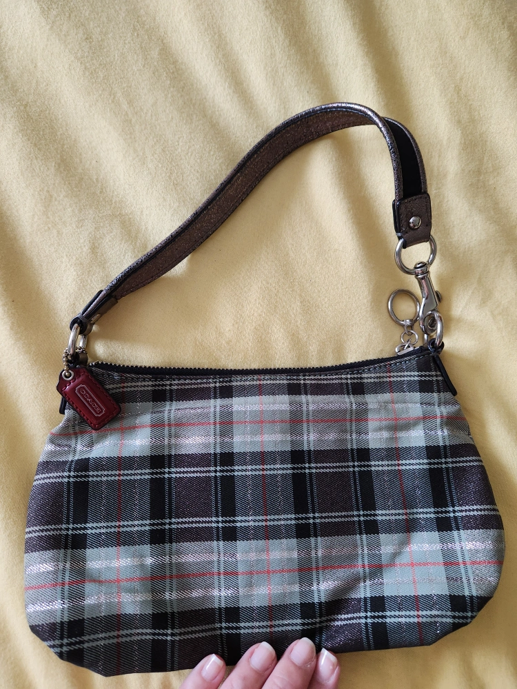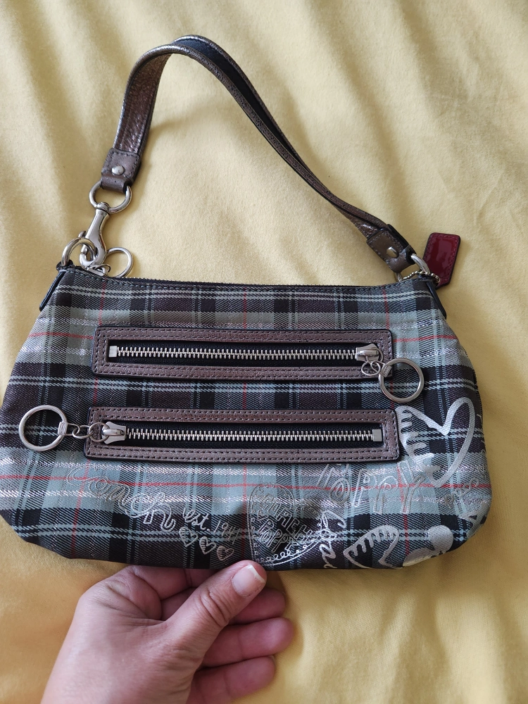 Vintage Authentic Adorable mini Coach bag. Features a plaid pattern, three zipper compartments, and a small shoulder strap. Perfect for evenings out or everyday use. Inside liner has markings see pics from use.