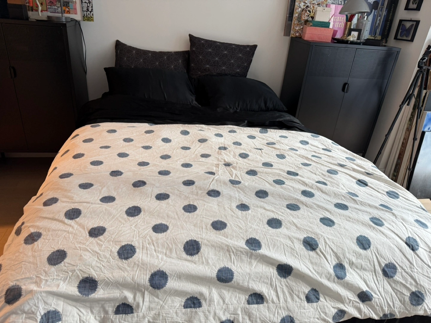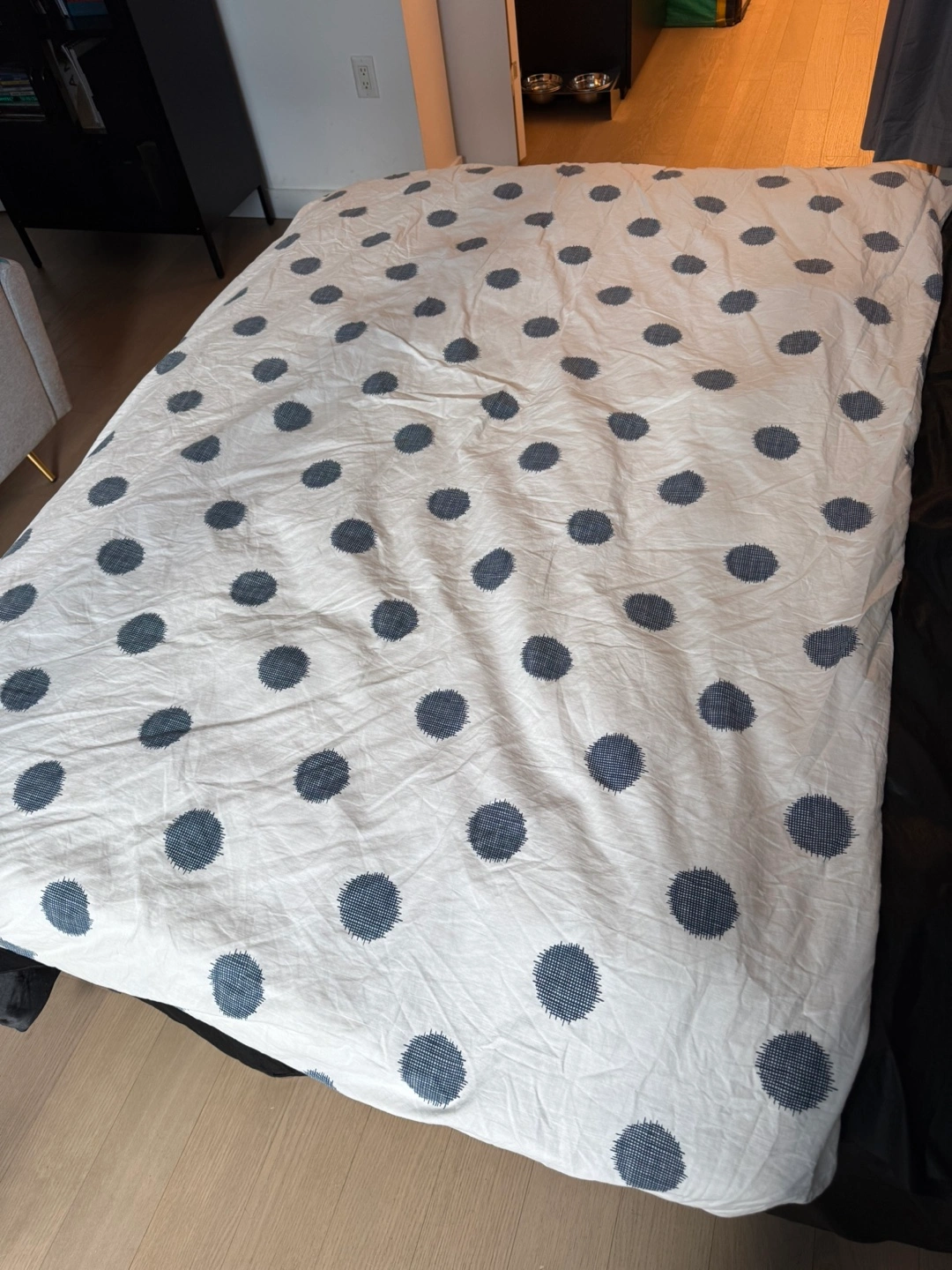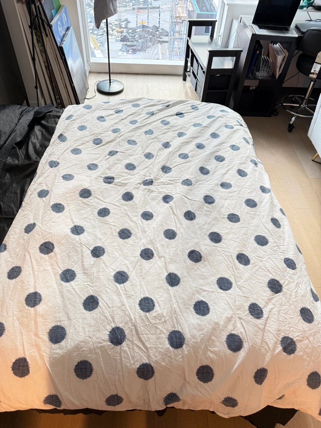 1000+Single/Twin Size Blue and White Dotted Duvet Cover & duvet White background with dark blue polka dots. Soft cotton material. Good used condition once! Not the best quality but it’s good for summer.