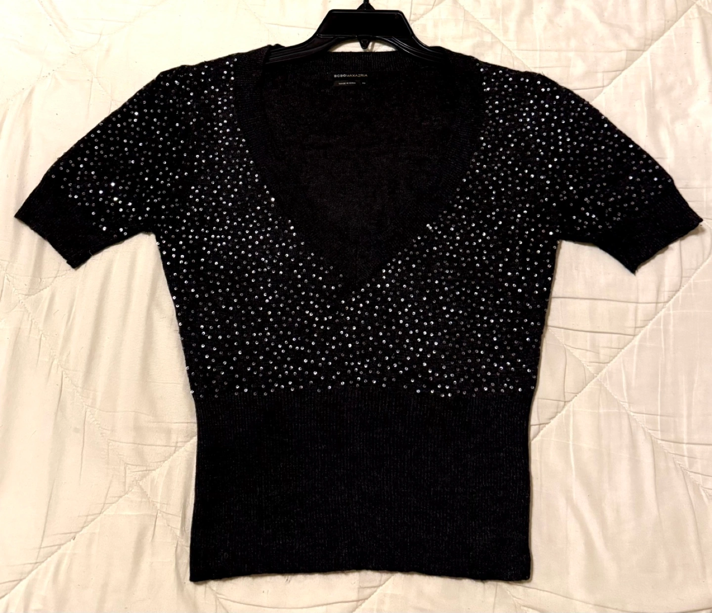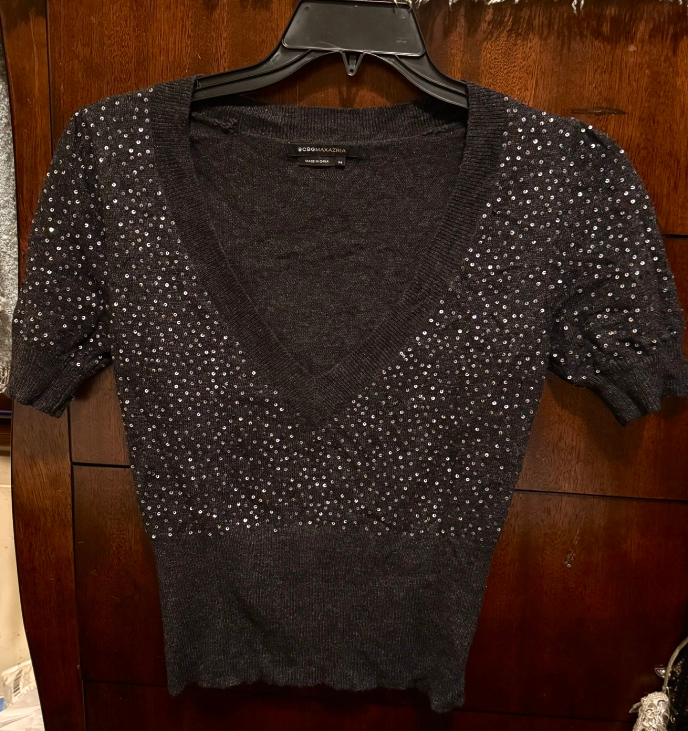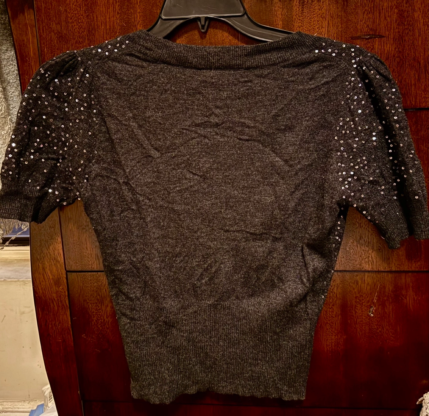 Short sleeve v-neck wool blend top Dark gray with silver sequins. Size M