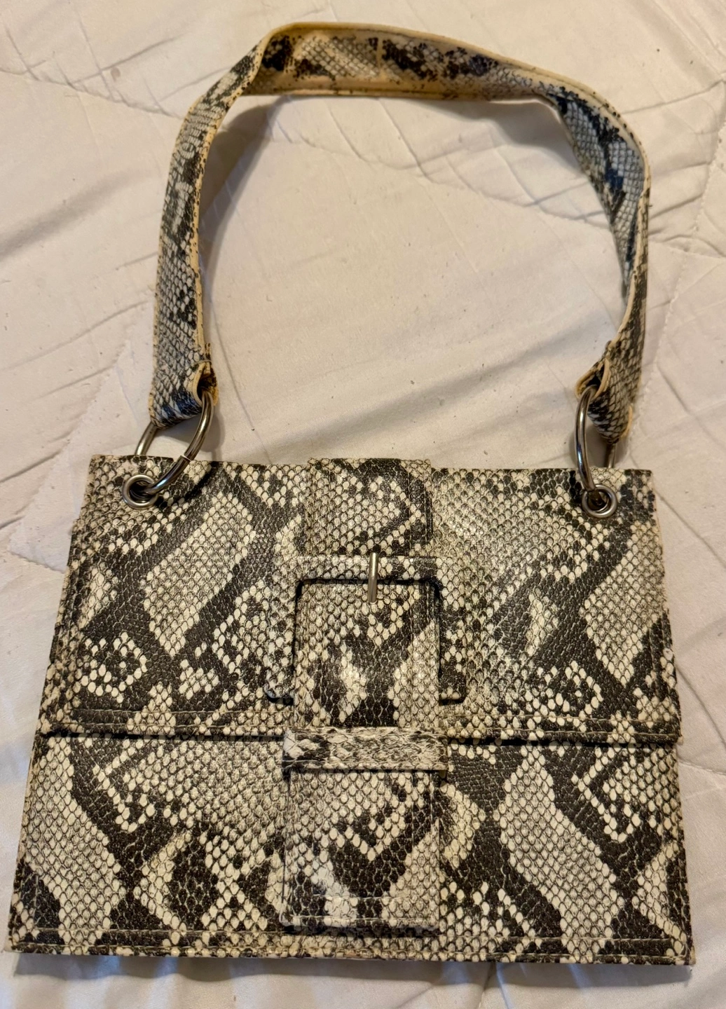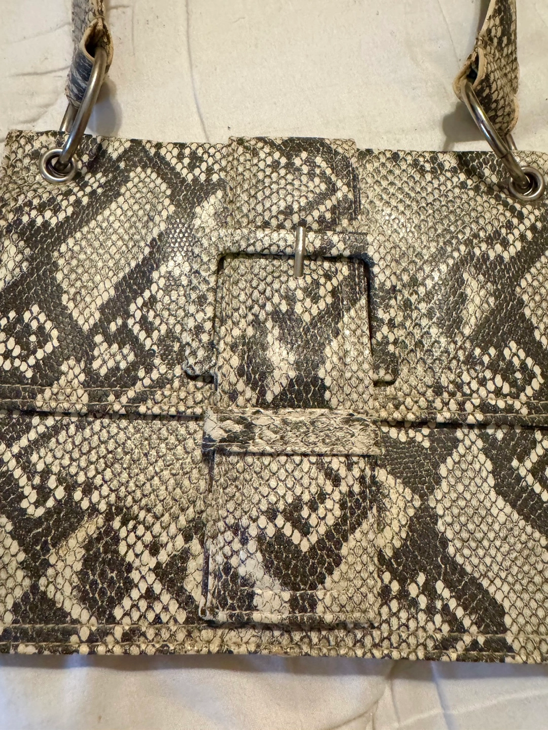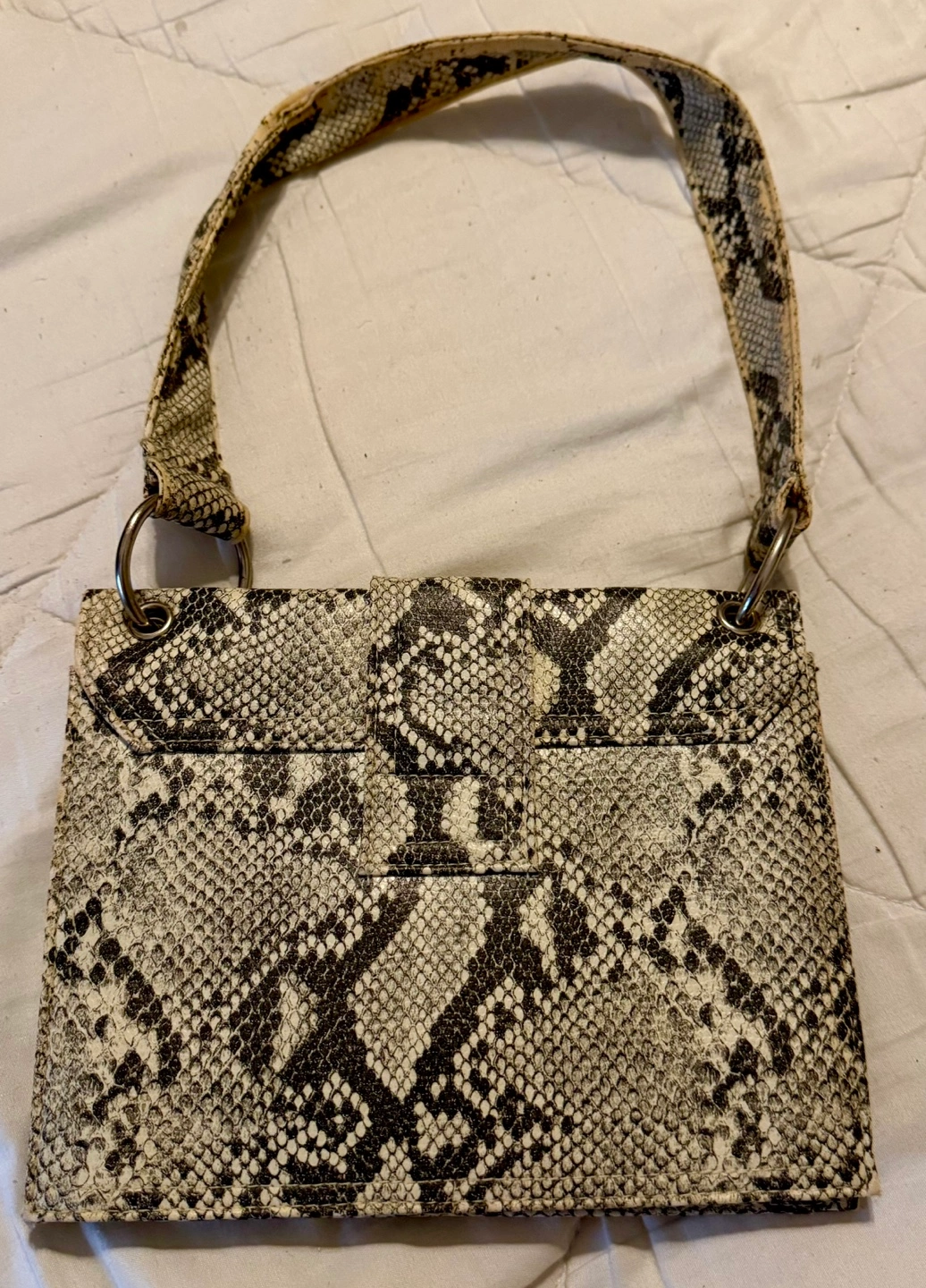 Small Vintage Python Snakeskin Tote Handbag Features a single shoulder strap and flap closure. Interior zipper pocket. Subtle wear.