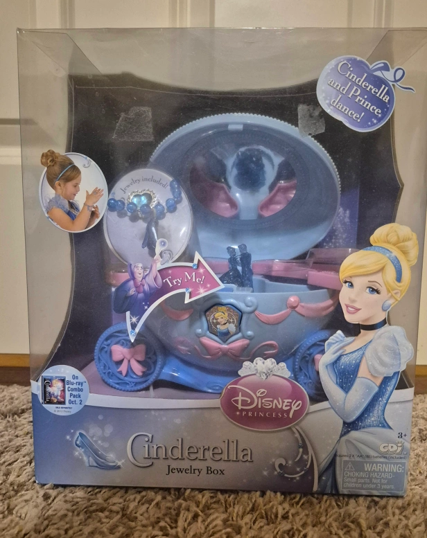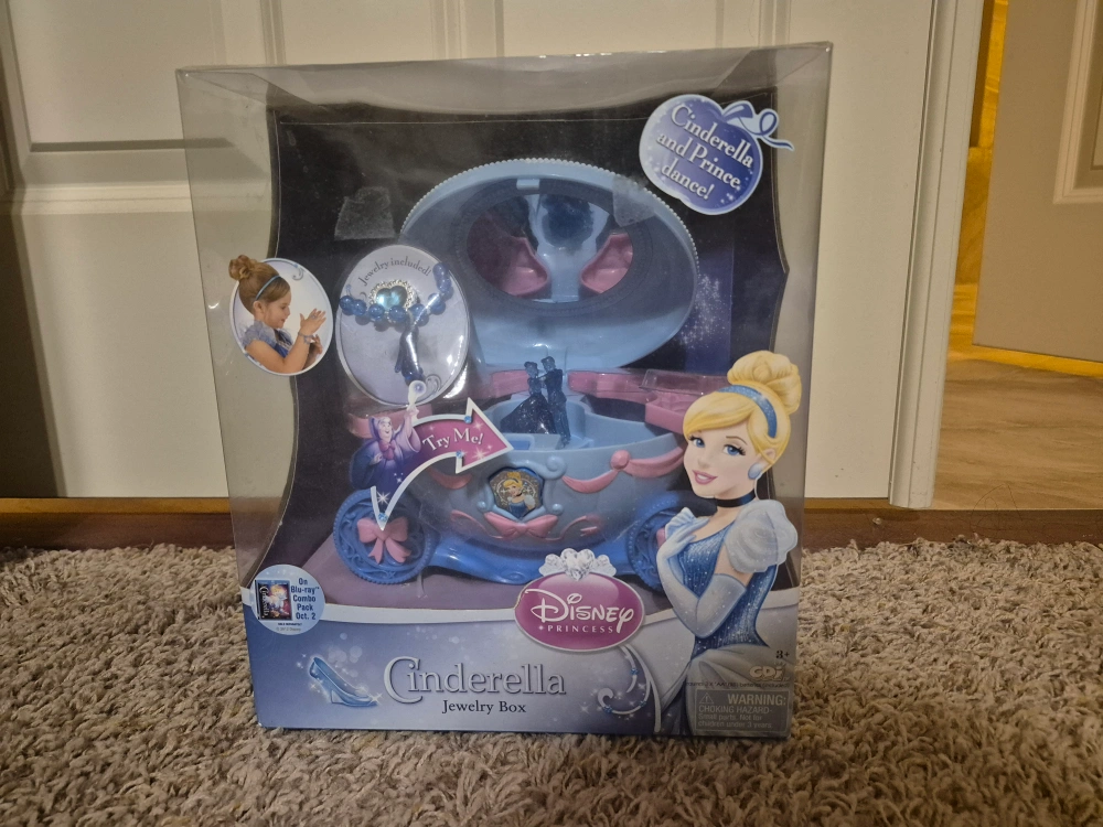 New in box. Cinderella themed jewelry box shaped like a carriage. Music plays when opened with dance of Cinderella and Prince. Perfect gift for a Disney fan.