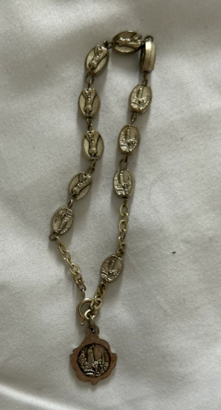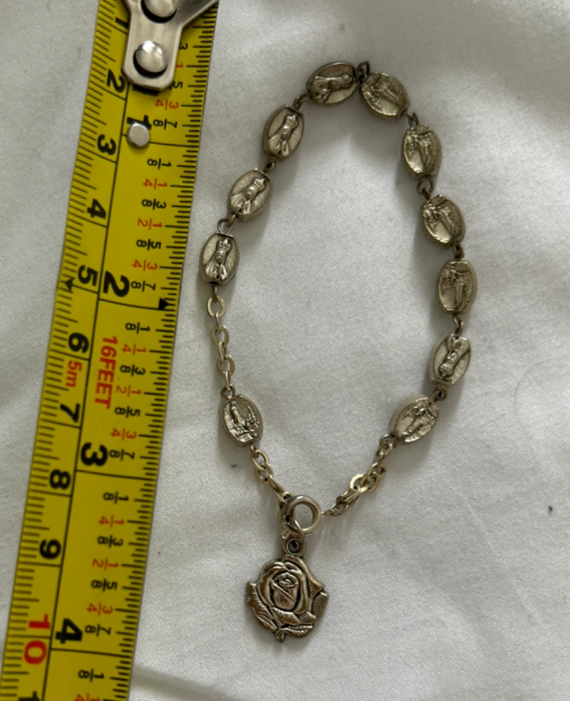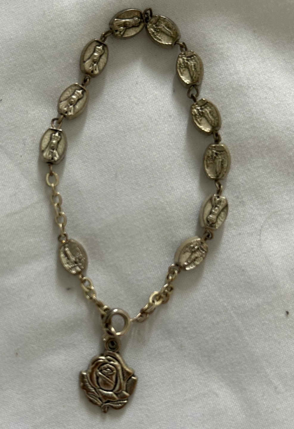 Silver tone metal bracelet. Features oval charms and a rose charm. Measures approximately 6 inches in length.