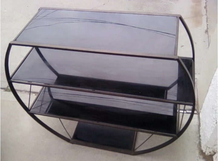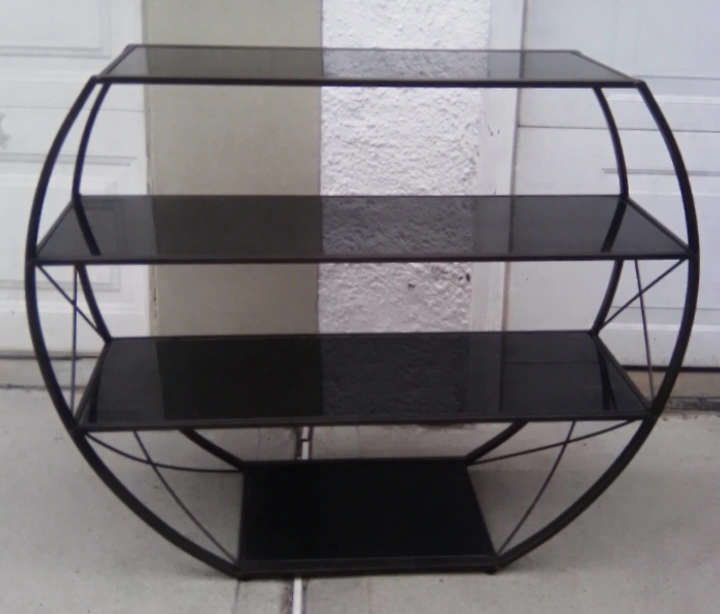 1000+Unique curved shelf. Three black glass shelves. Metal frame. Great for displaying items. pickup in Astoria Queens.