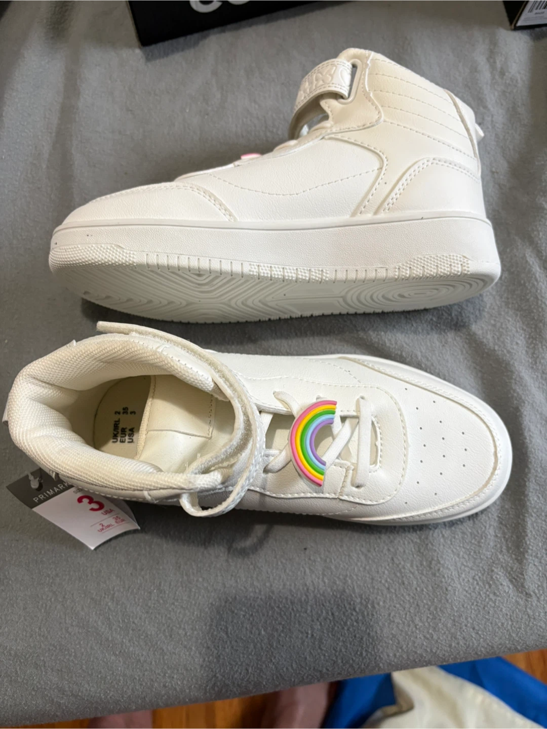 White high-top sneakers from Primark. Features a hook-and-loop strap and rainbow charm detail. Size is 3 Never worn brand new.