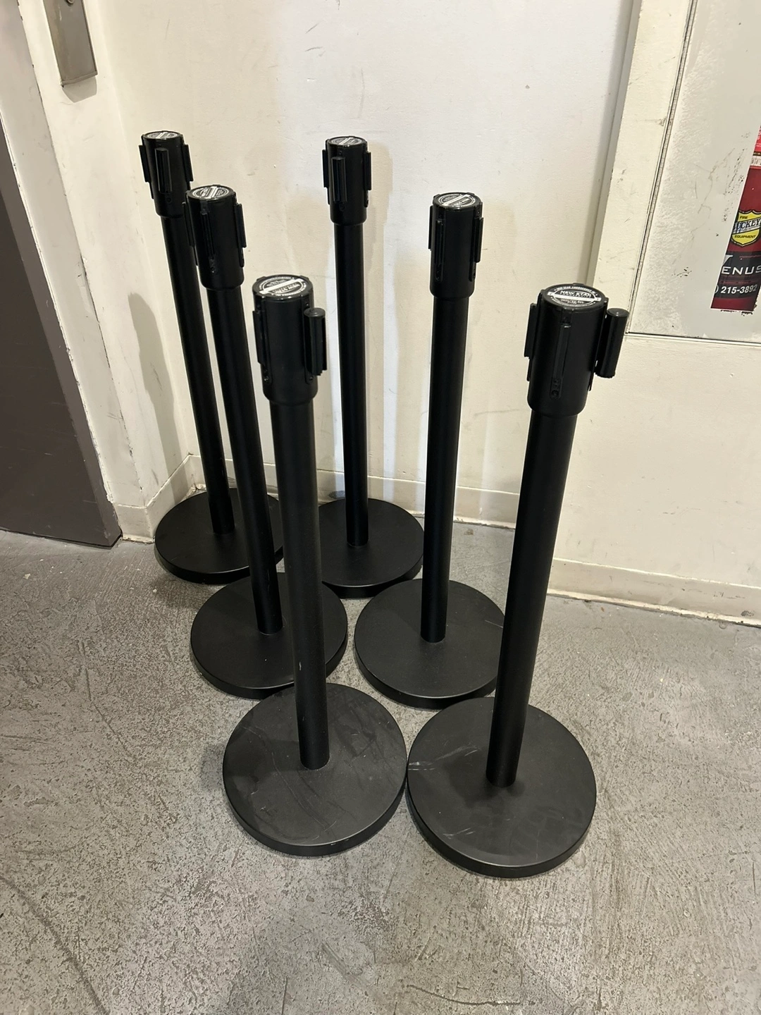 Set of six black retractable stanchions. Great for crowd control. Floor standing. Price x each 1