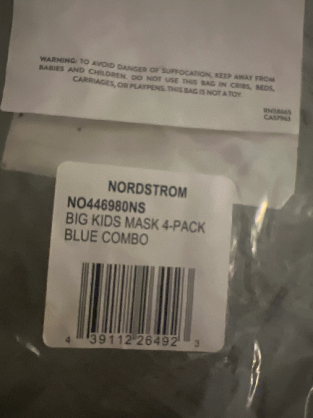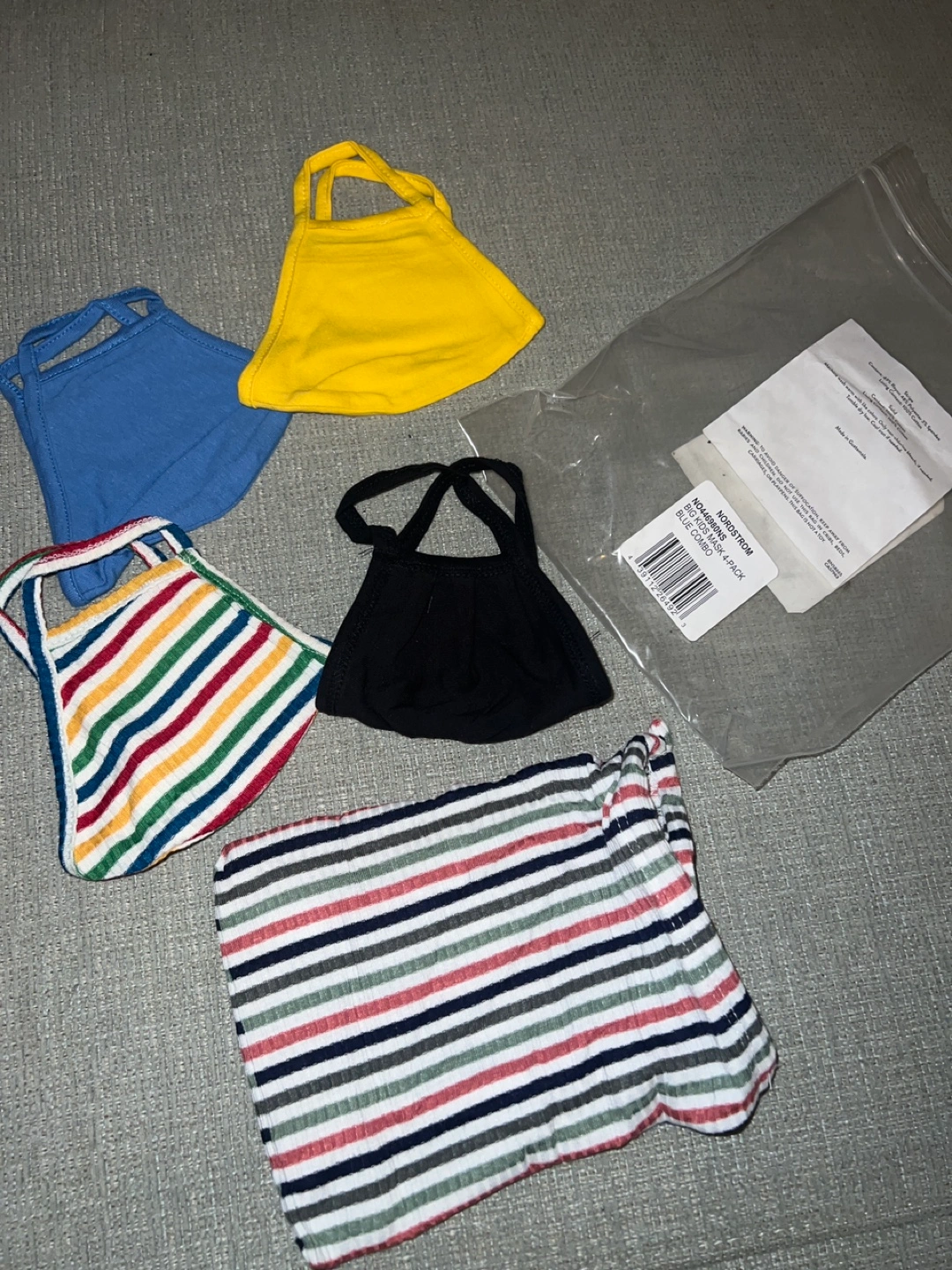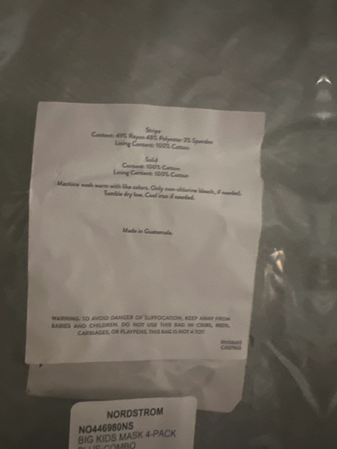 Four kids' masks. Includes blue, yellow, black, and rainbow striped masks. Cotton material. Machine washable. Made in Guatemala.
