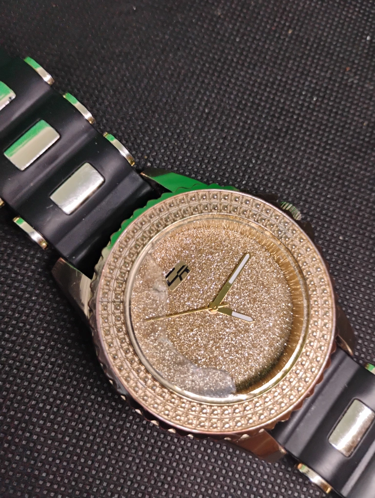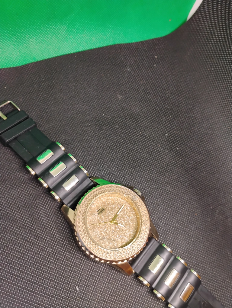 Sparkly gold face. Black silicone band. Stainless steel back. Quartz movement. used needs battery