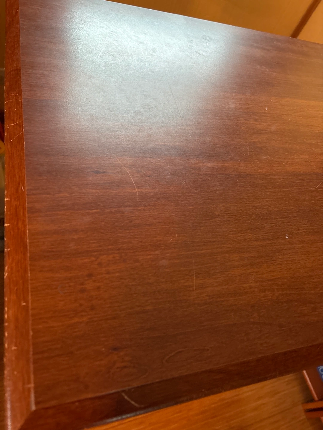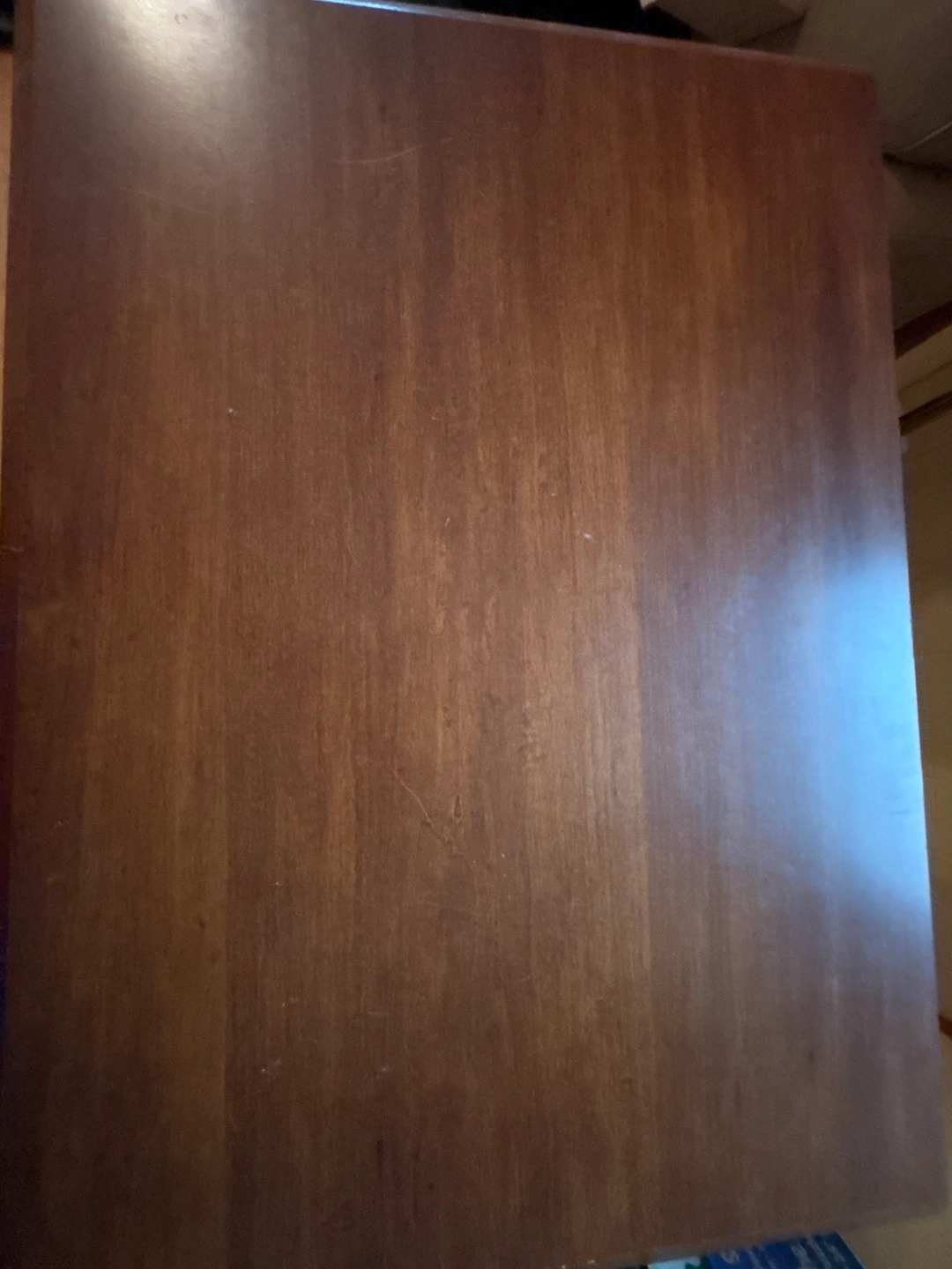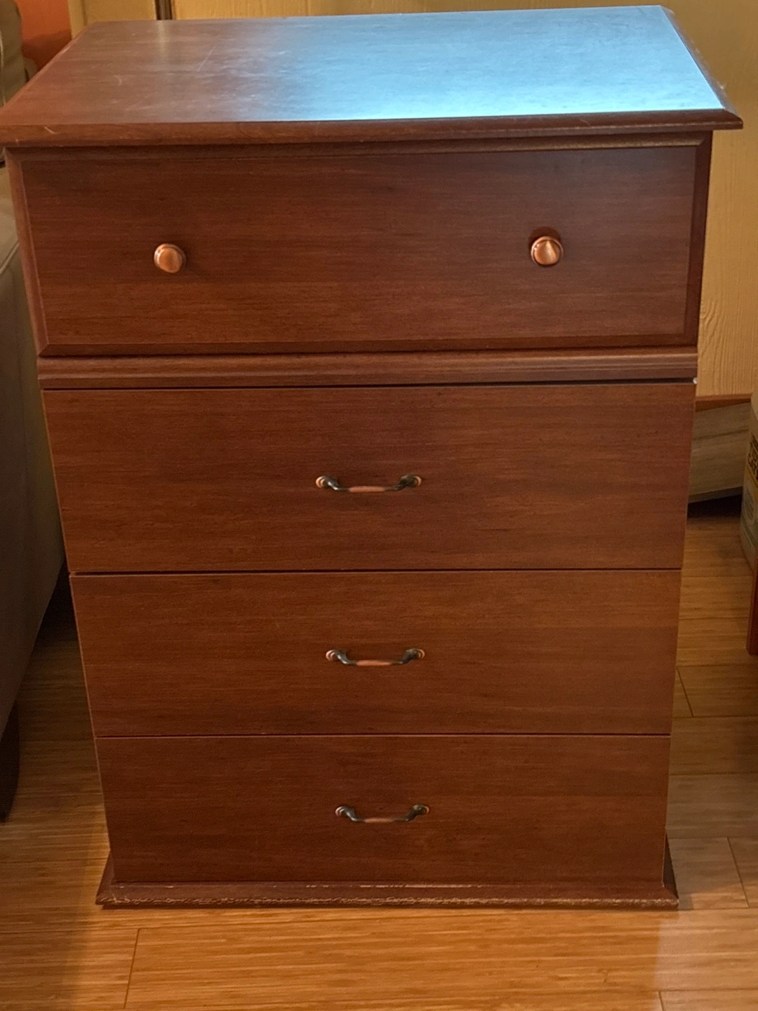 Dark brown wooden chest of drawers. Four drawers, one smaller top drawer. Simple design, metal drawer pulls. Some minor surface scratches.