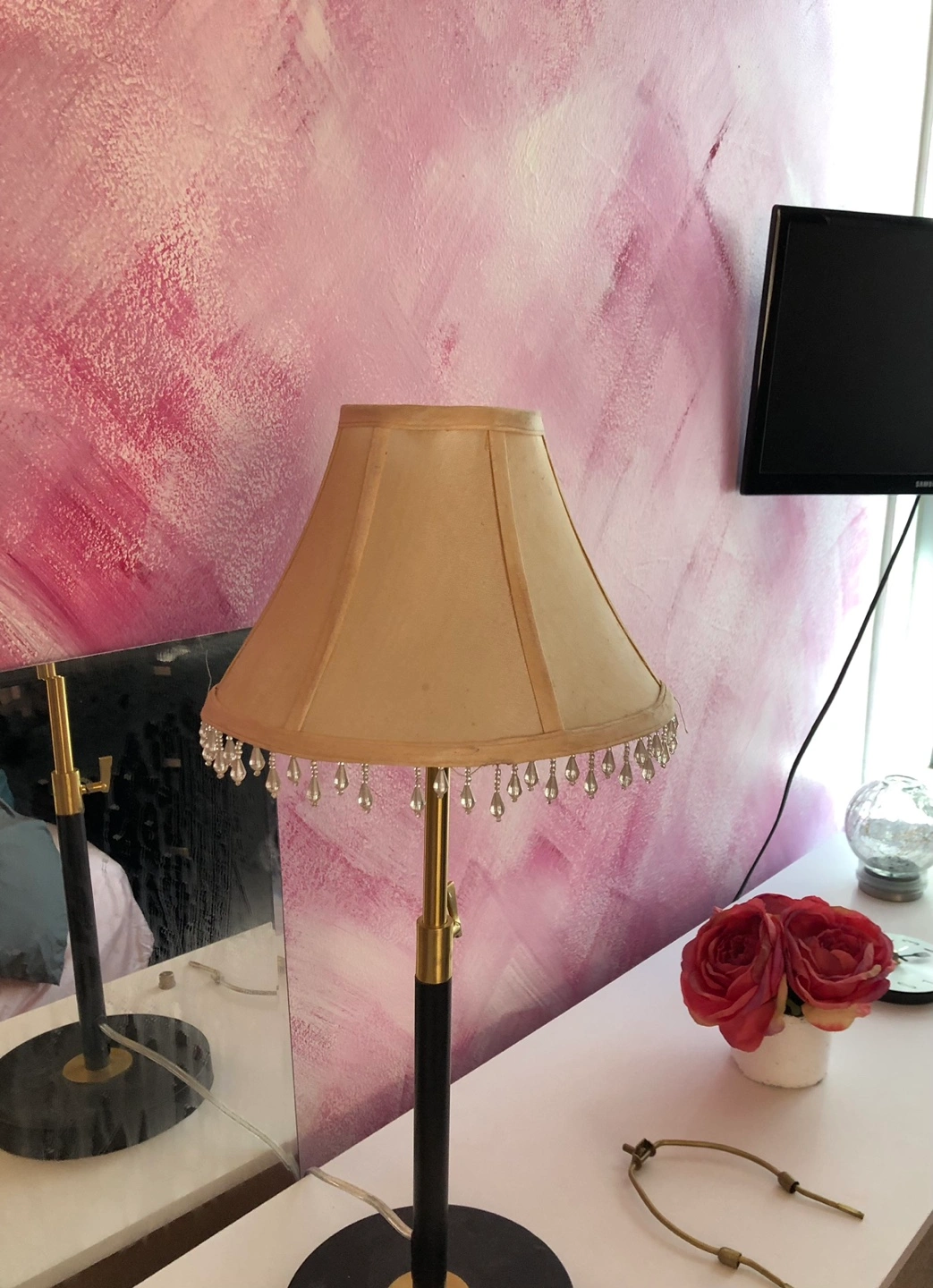 Beautiful vintage lamp shade. Features a clear beaded trim accents. Perfect for a bedside table lamp or vanity.