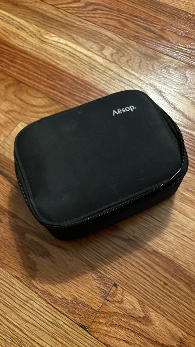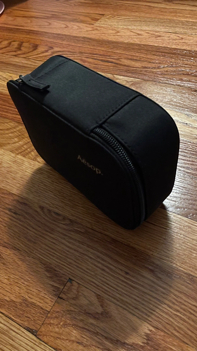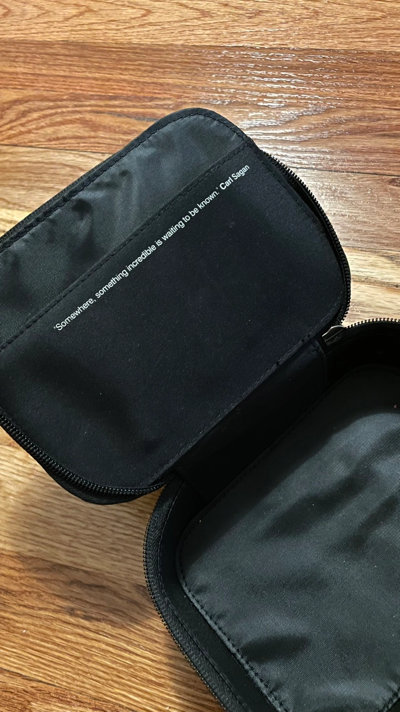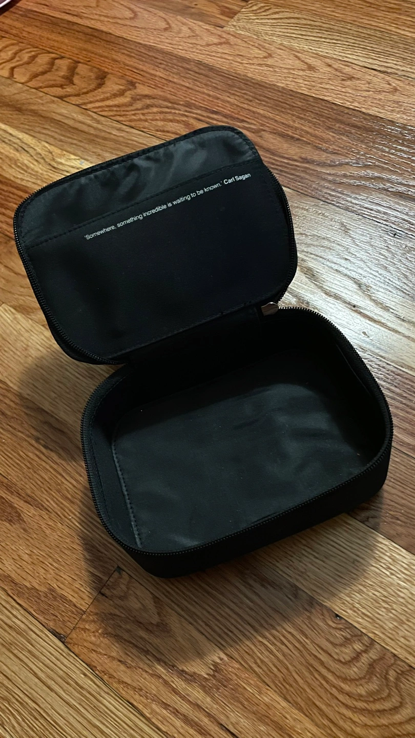 463Black zippered travel case. Interior quote: "Somewhere, something incredible is waiting to be known." - Carl Sagan. Small, lightweight, and perfect for travel. Sturdy, holds shape well and has one interior pocket. Has some light stains. Pick up in East Village. Cash only please.