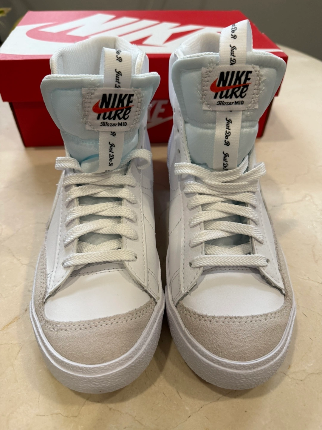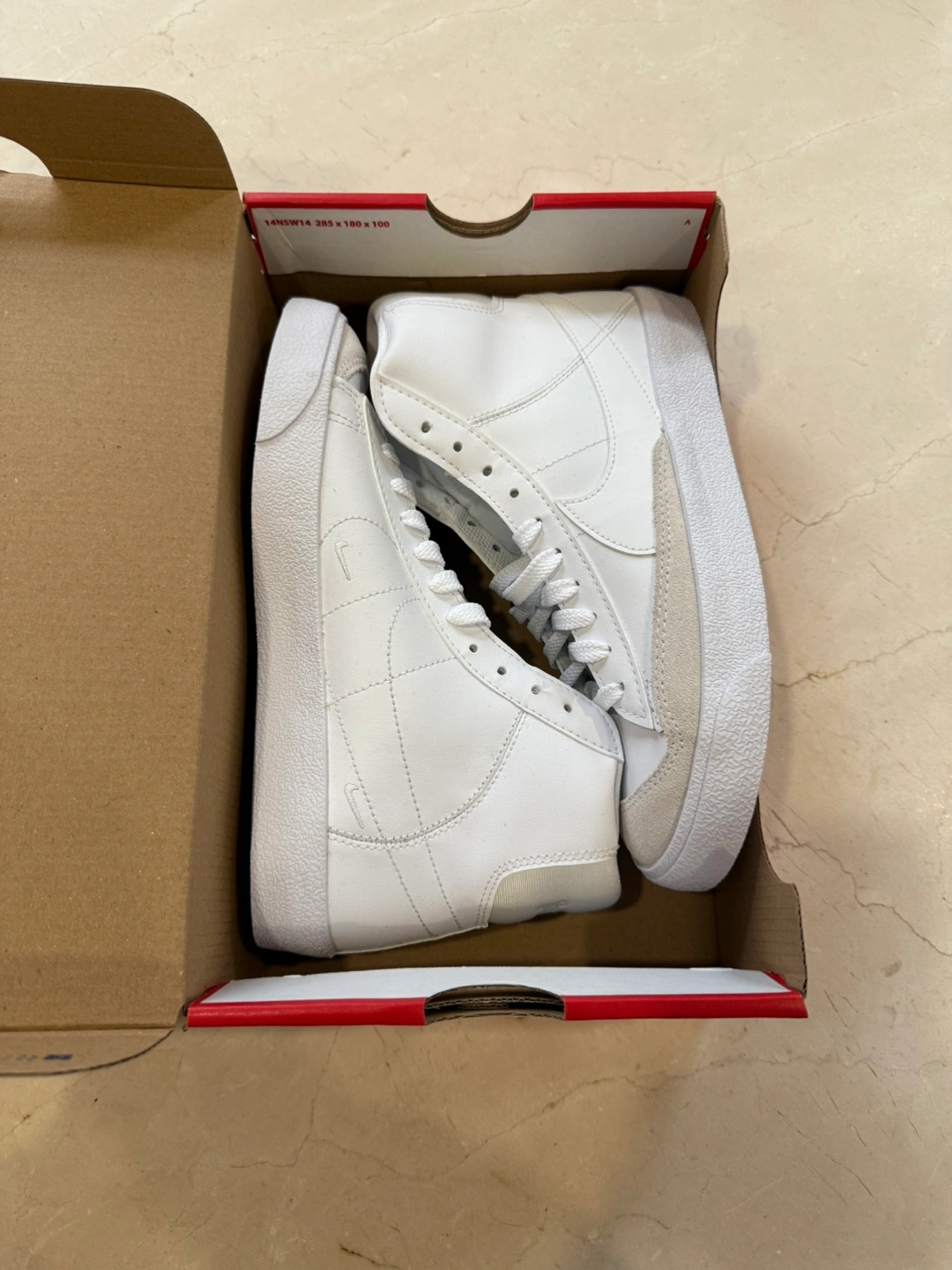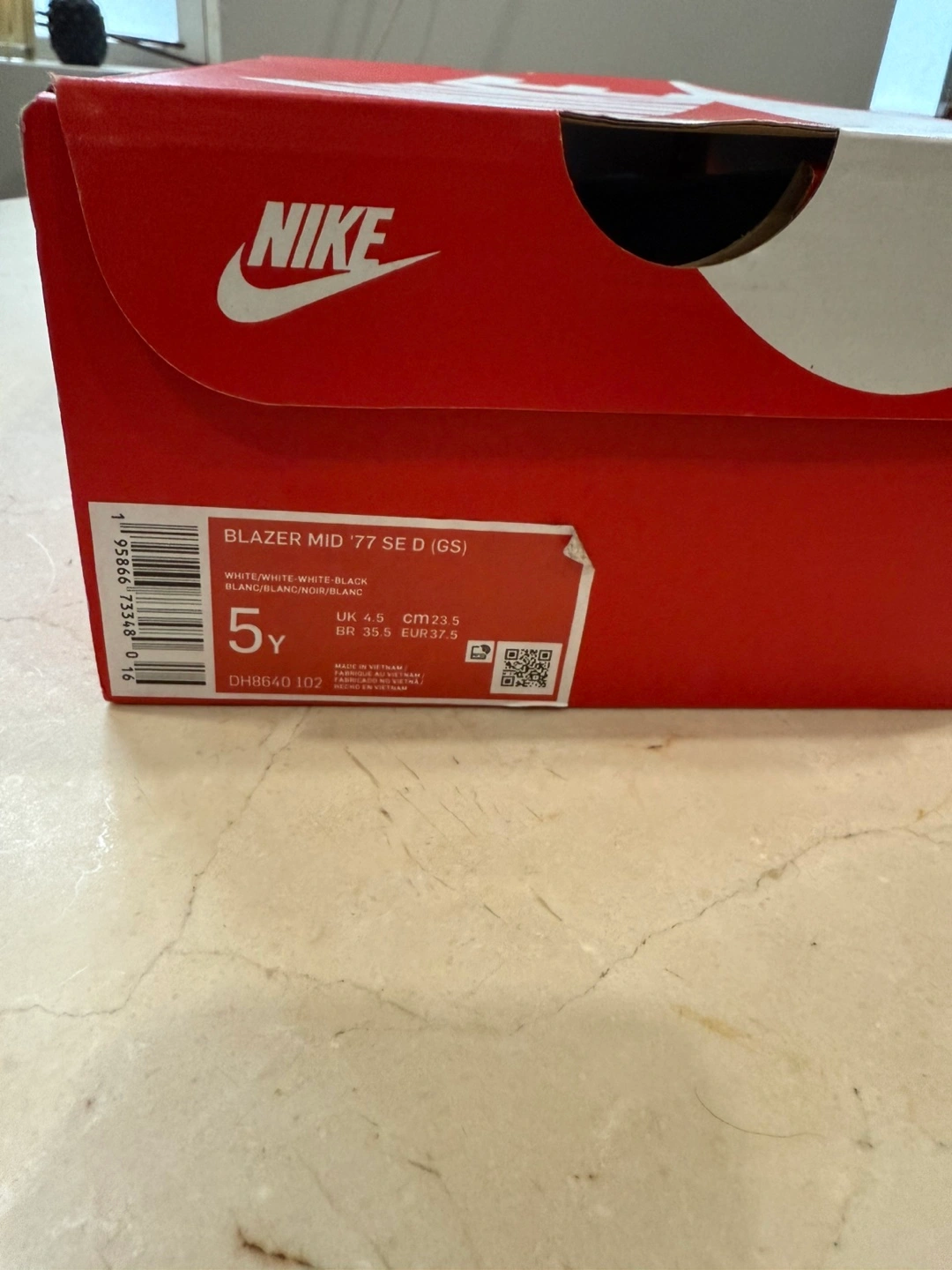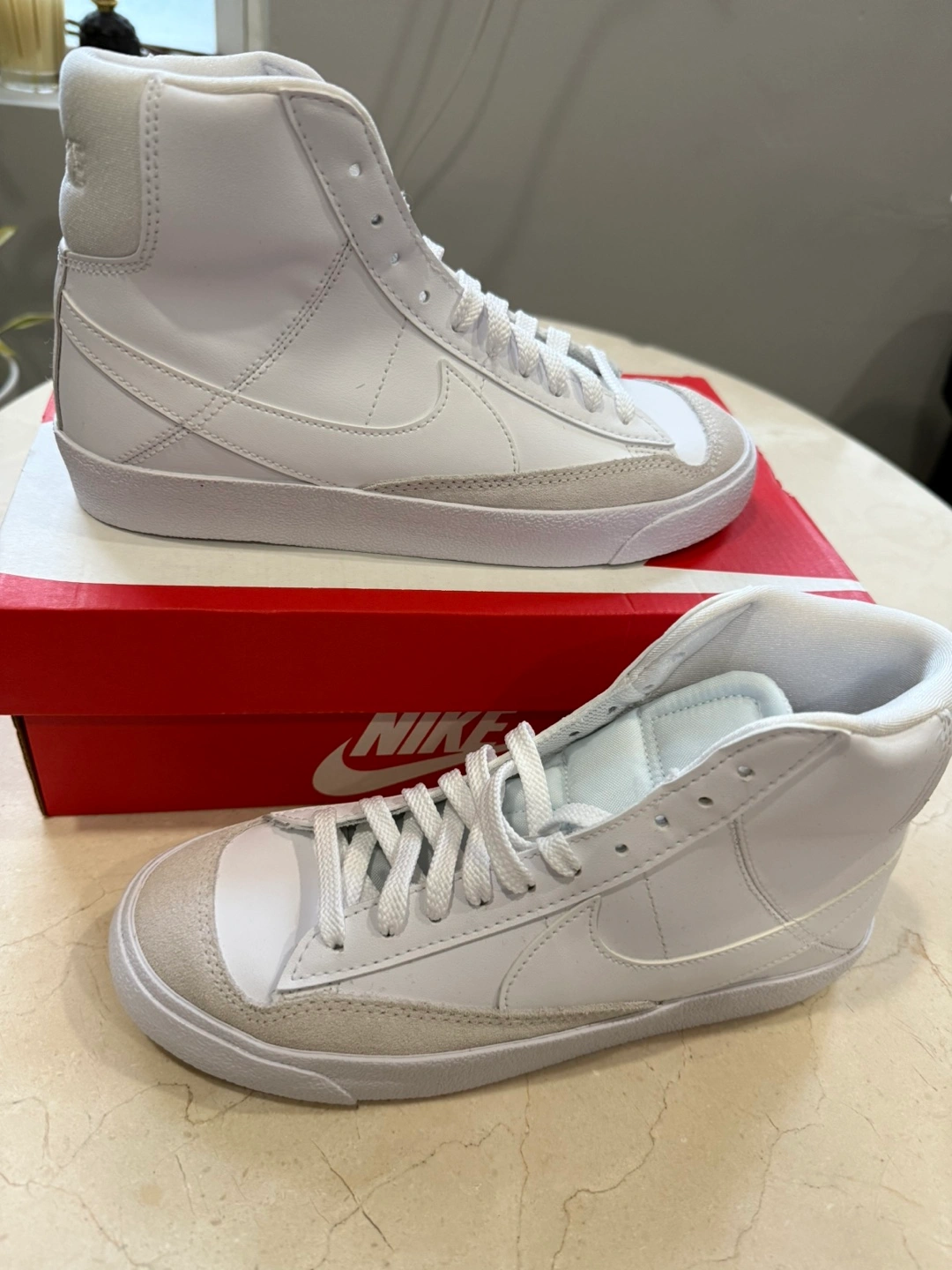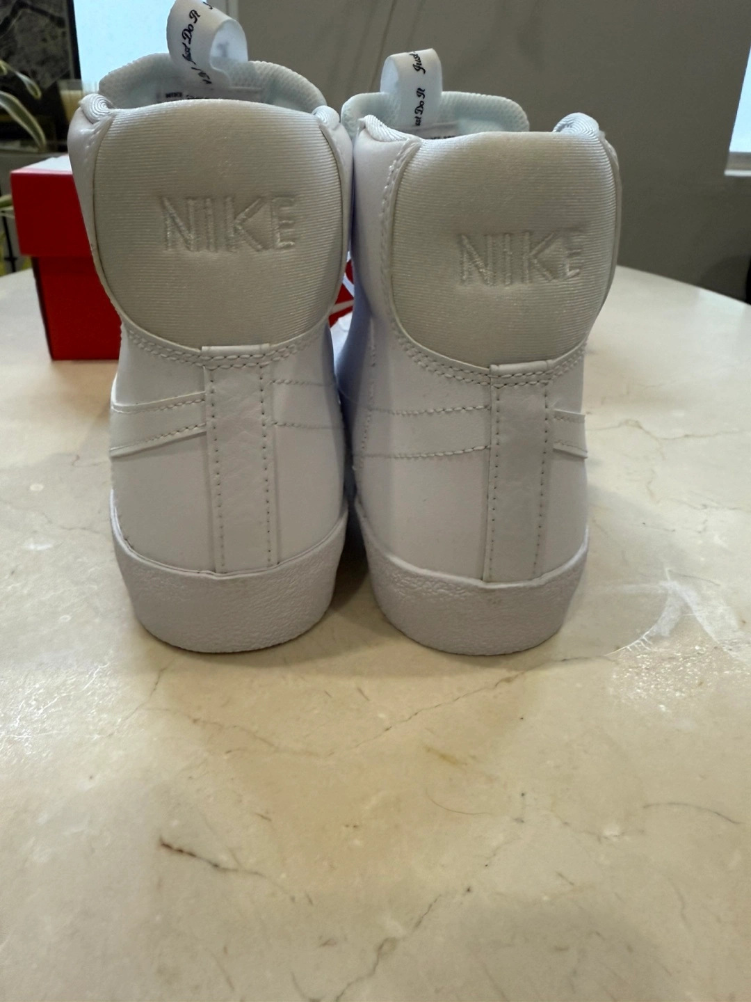 Brand new, never worn Nike Blazer Mid '77 sneakers. White leather upper, suede accents. Classic design, high-top style. Comes in original box. Youth size 5Y Women’s size 6.5