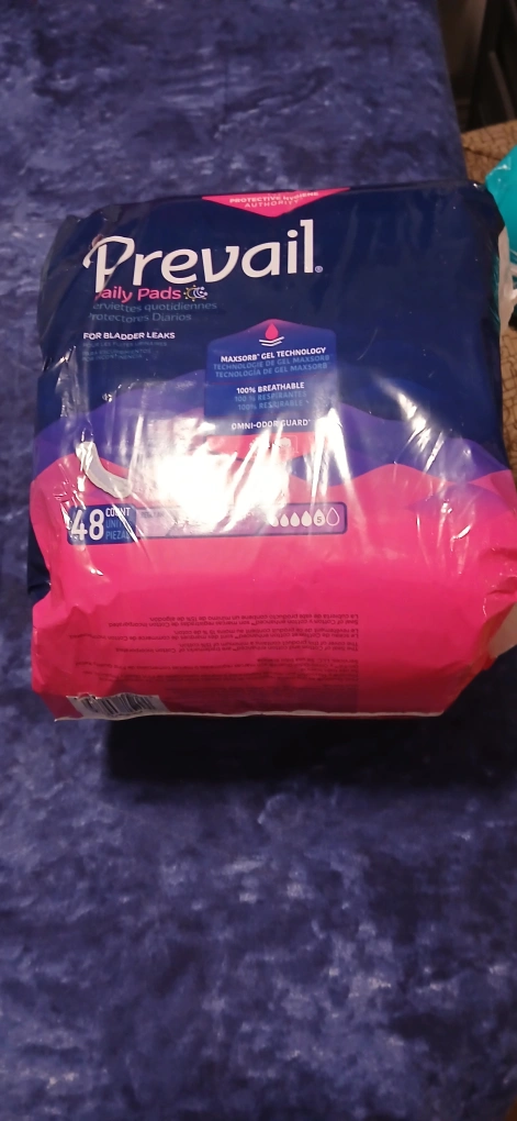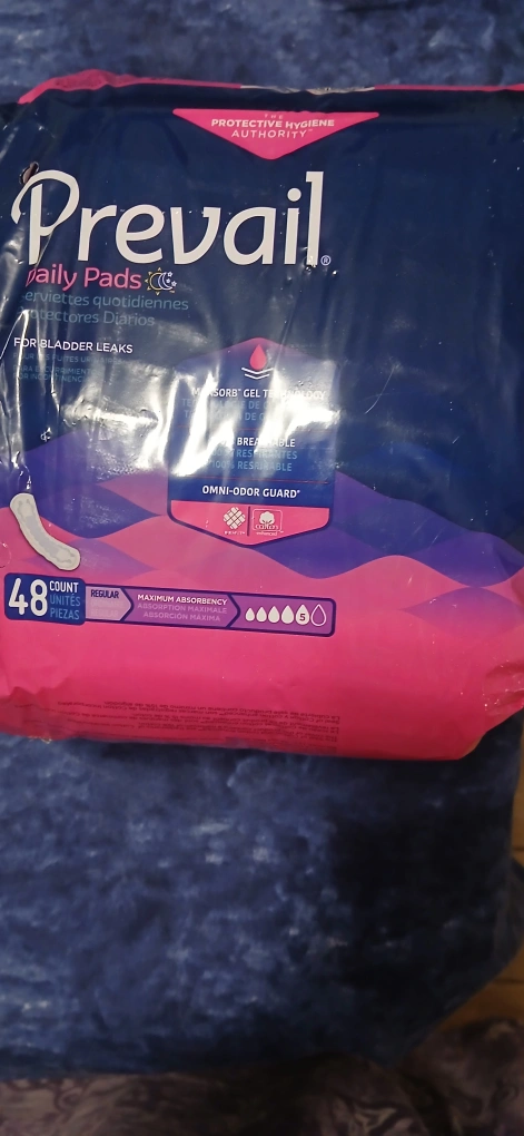 unopened package of Prevail Daily Pads. Regular absorbency. 48 pads per package. Designed for bladder leaks. Maximum absorbency. Features MaxSorb Gel Technology, 100% breathable, and Omni-Odor Guard.i have extra so I'm giving a couple of packs away Sharing is caring buy one get one free 🧡Freestyle#🥕