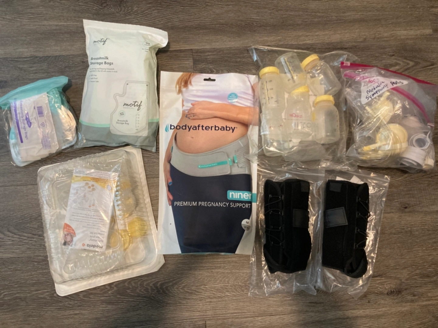 Breast milk storage bags, bottles, pump parts, pregnancy support belt, and wrist/ankle supports.