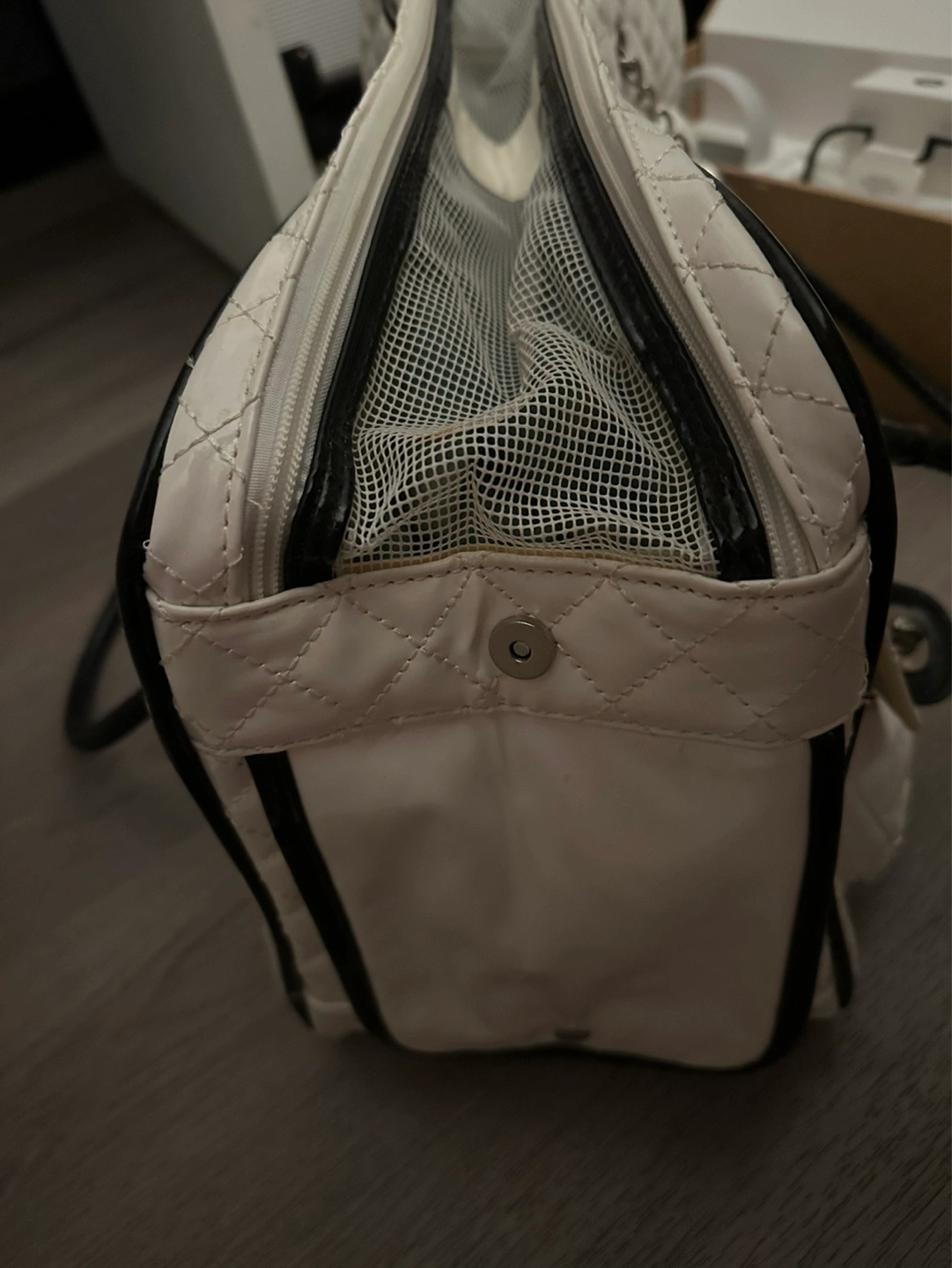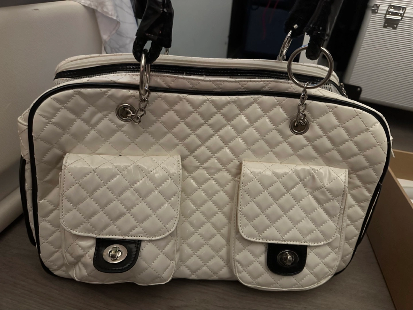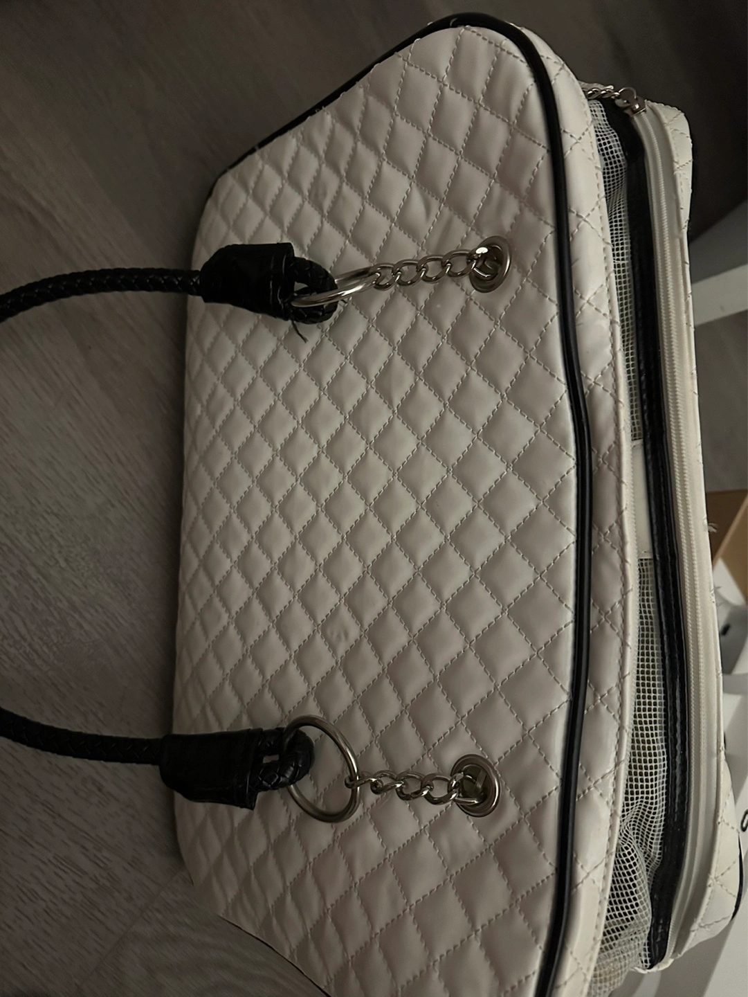 White quilted pet carrier. Black trim and hardware. Mesh ventilation. Two pockets on the front. Rope and chain handles. Used only once