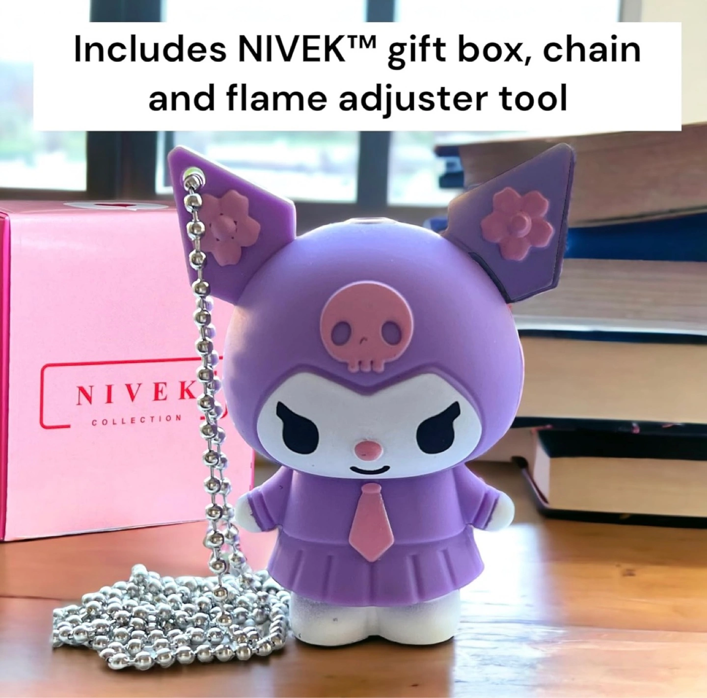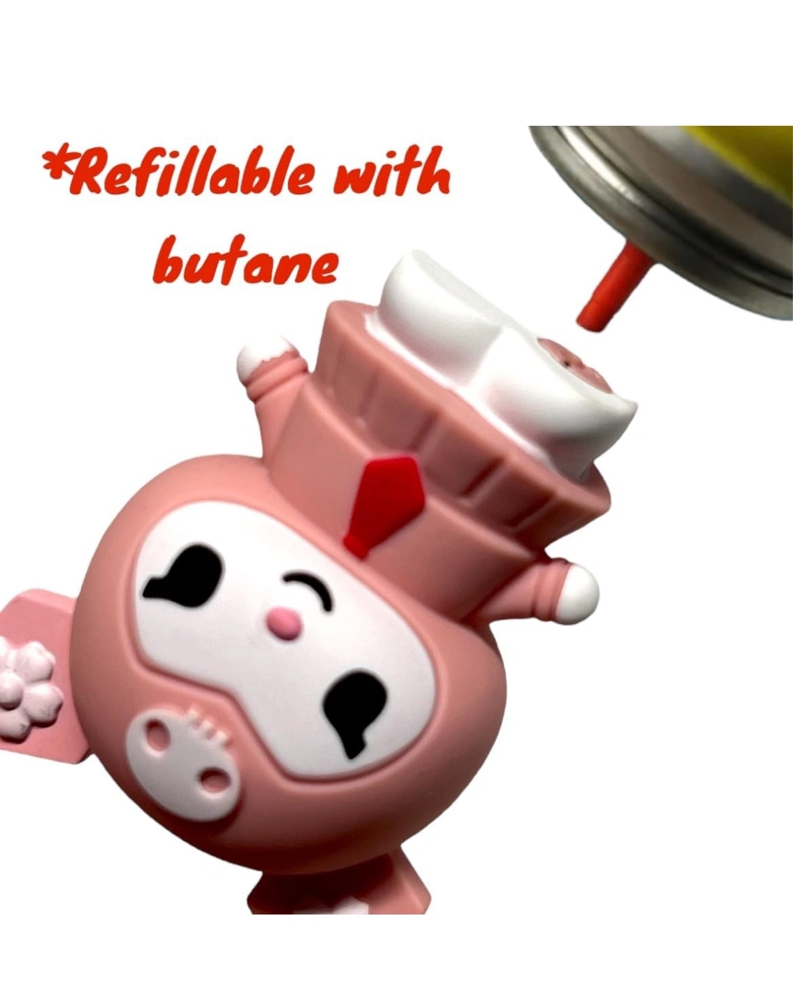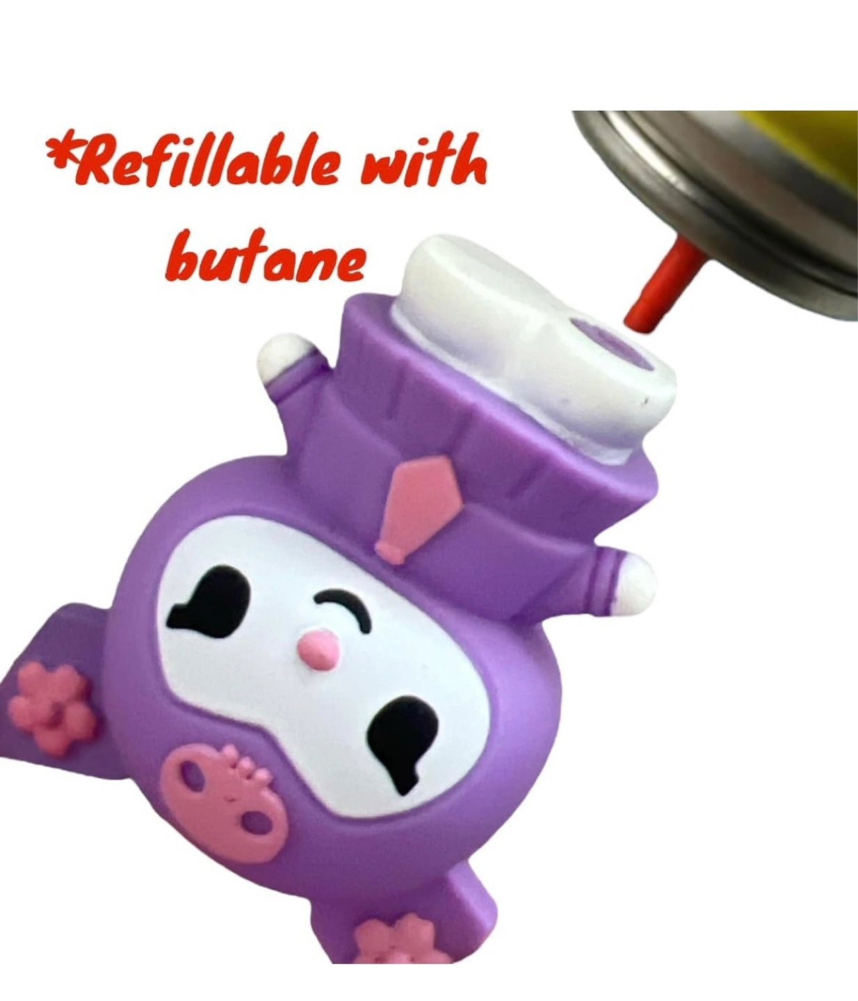 Adorable purple Kuromi lighter. Refillable with butane. Includes gift box and chain. Flame adjuster tool included. Approximately 2.5" tall. 1 pink 1 purple & 3 cans of butane fuel for 27$