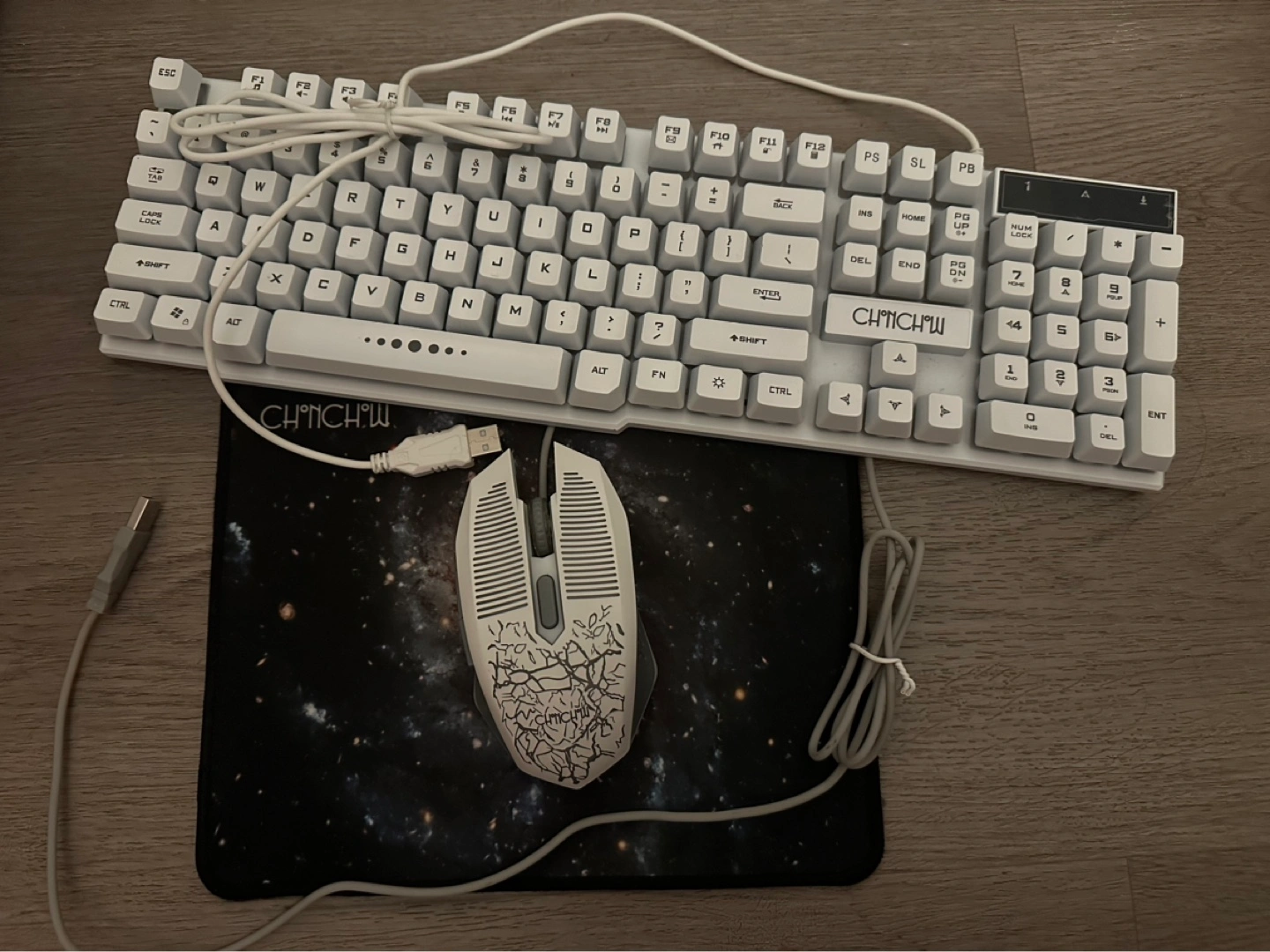 Rainbow light up White wired keyboard and mouse with matching mousepad. USB connection. Compact keyboard. Galaxy print mousepad. Good for students or home use.