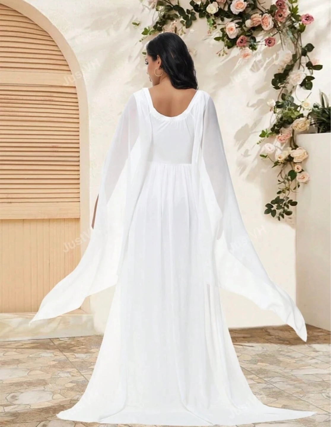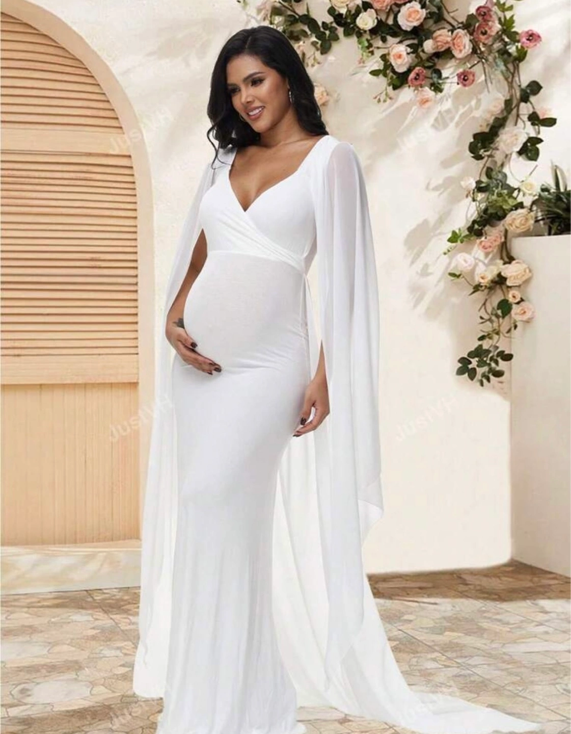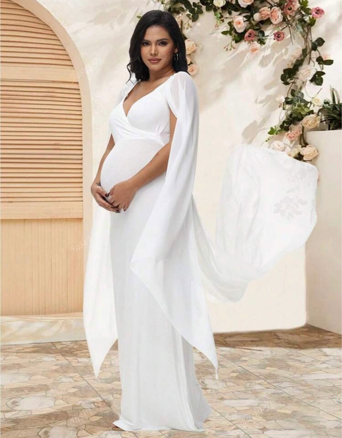 Elegant maternity photoshoot dress. Floor-length gown, V-neck, long cape sleeves. Perfect for maternity photos.