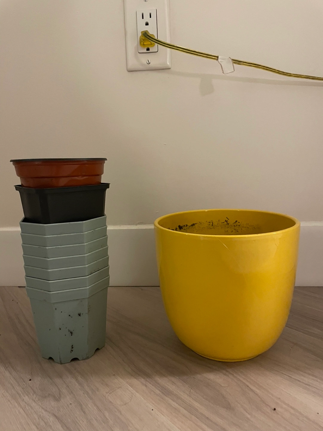 Stack of small plastic plant pots, various colours. One large yellow plastic planter. Some soil residue.