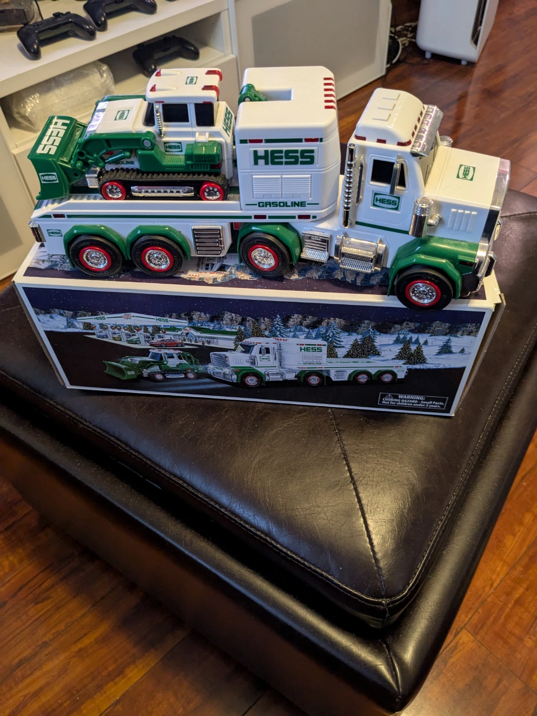 Hess toy truck and bulldozer. Green and white. In original box. Collector's item.