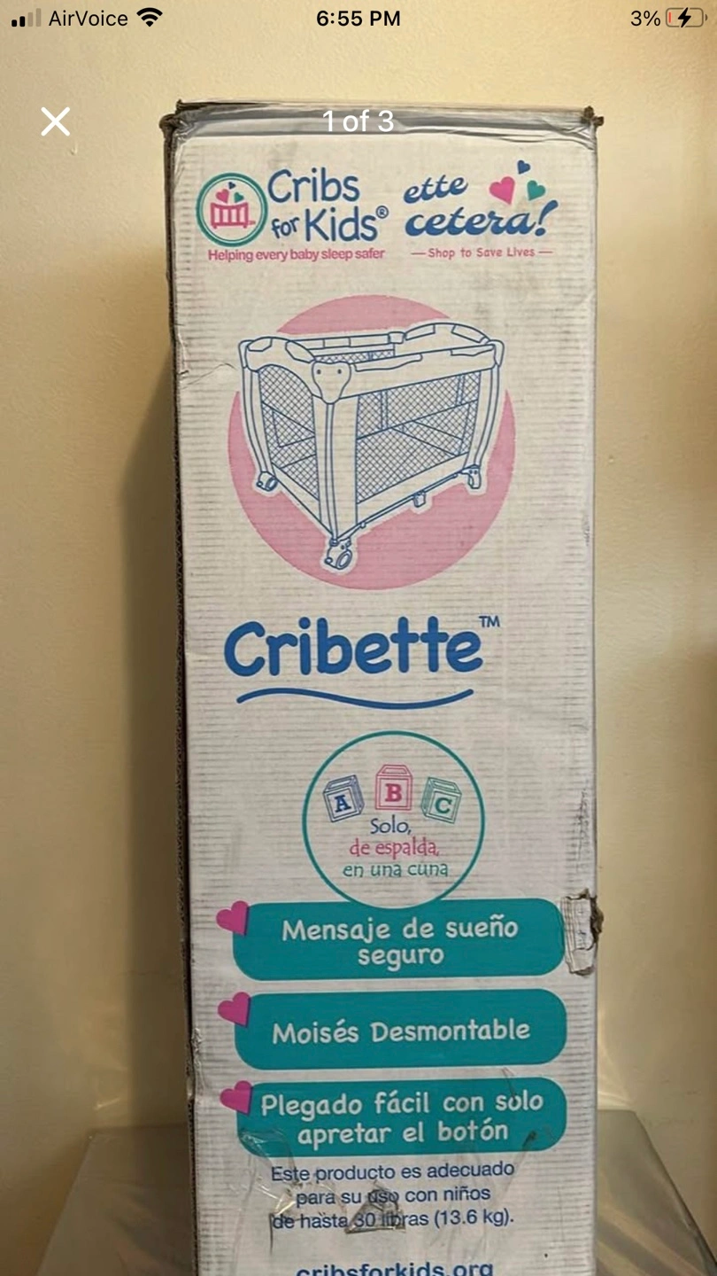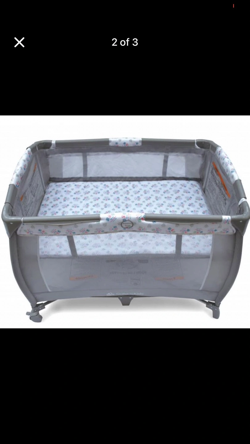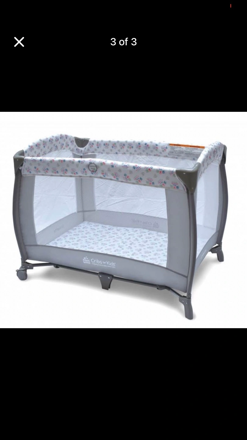 Gray and white portable crib. Easy to fold and includes a carrying case. Lightweight and perfect for travel. Suitable for infants. Brand new in the box