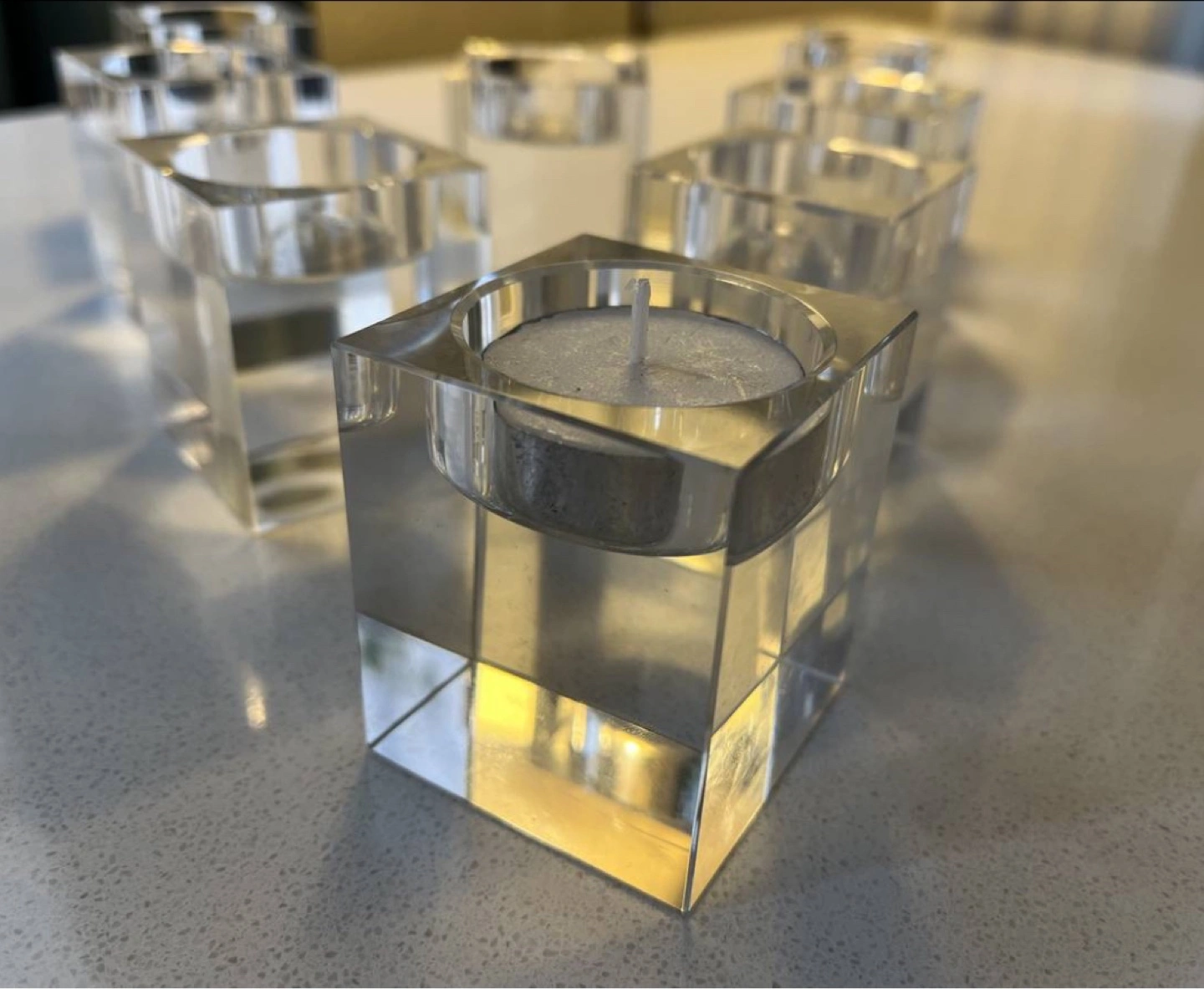Clear crystal cube candle holders. Perfect for tea lights or small votives. Set of eight.