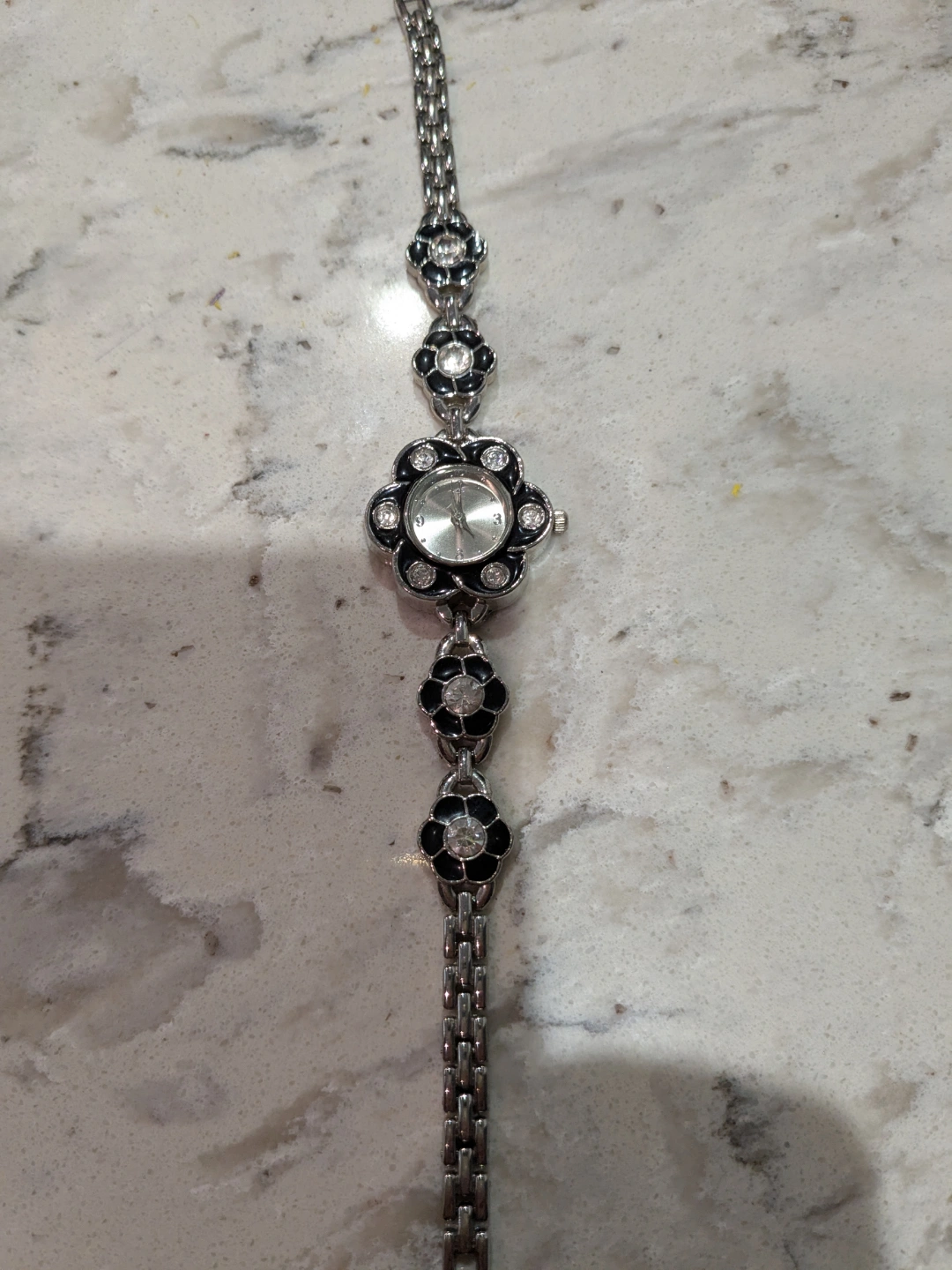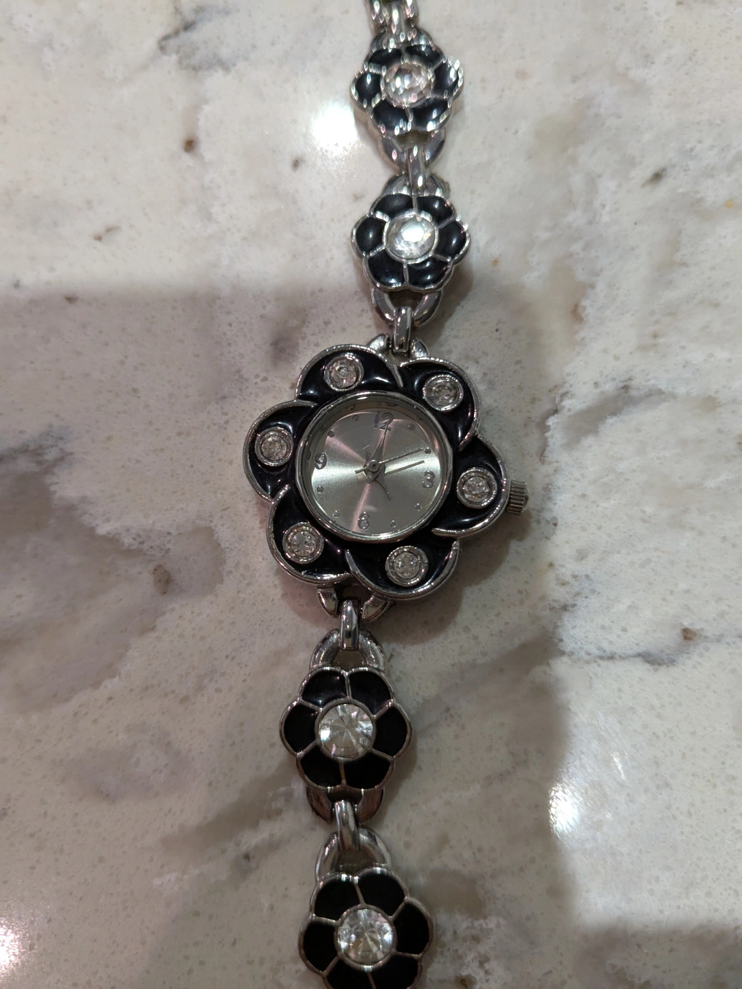 Silver tone metal band. Black flower face. Rhinestone accents. Analog.