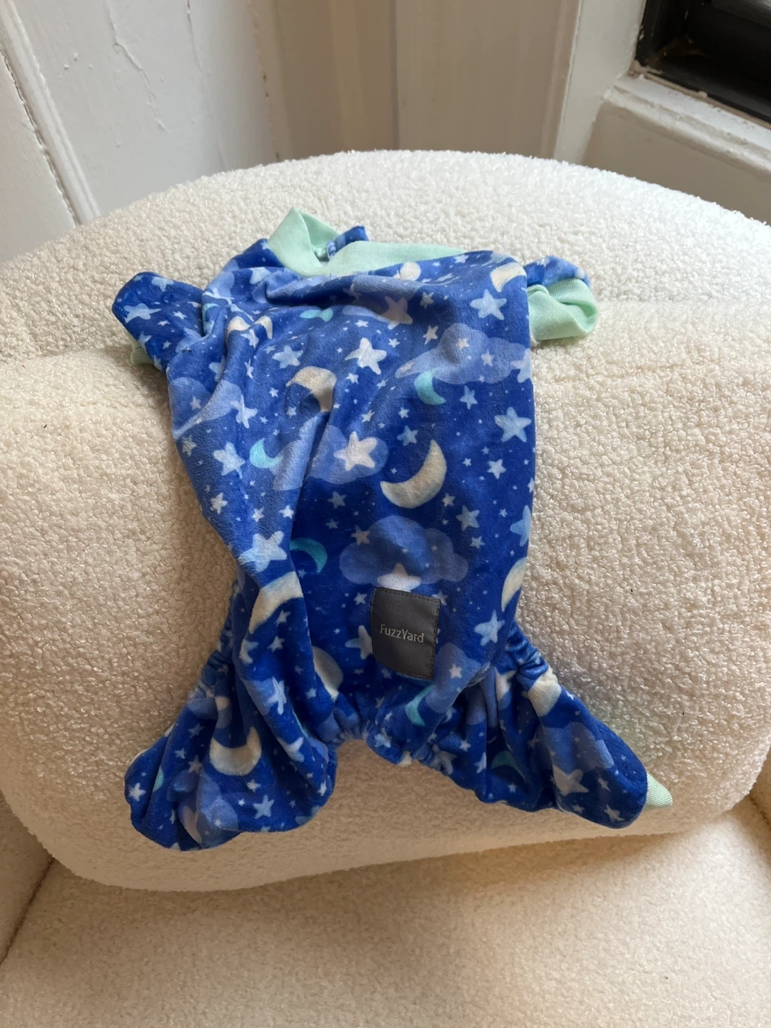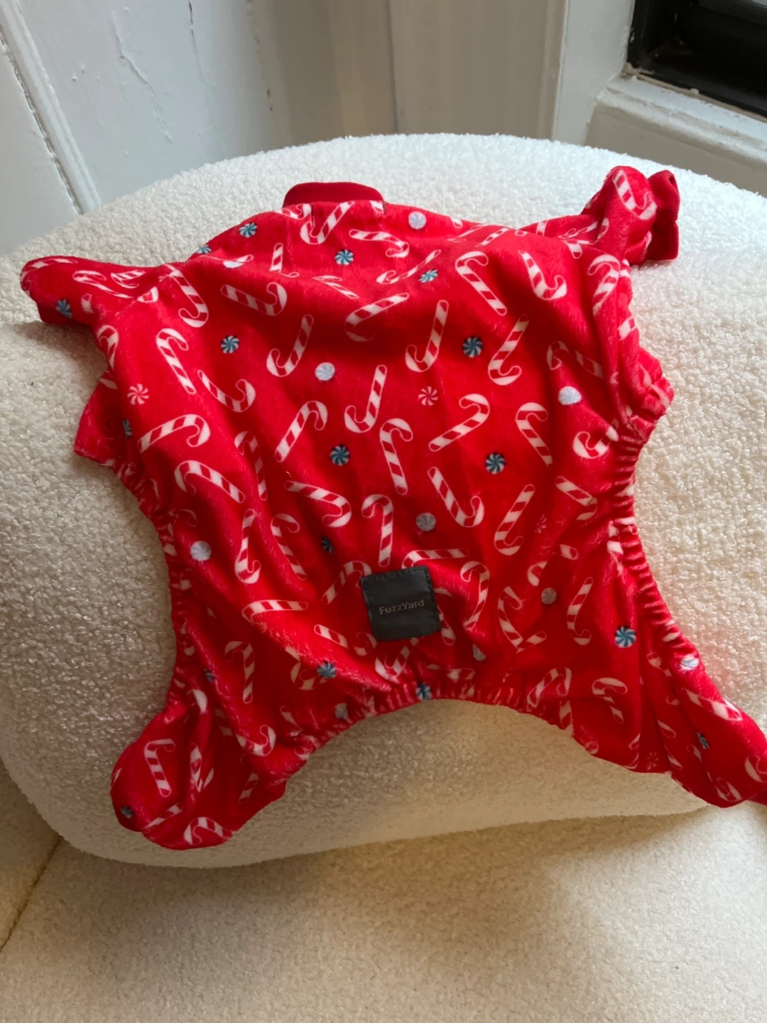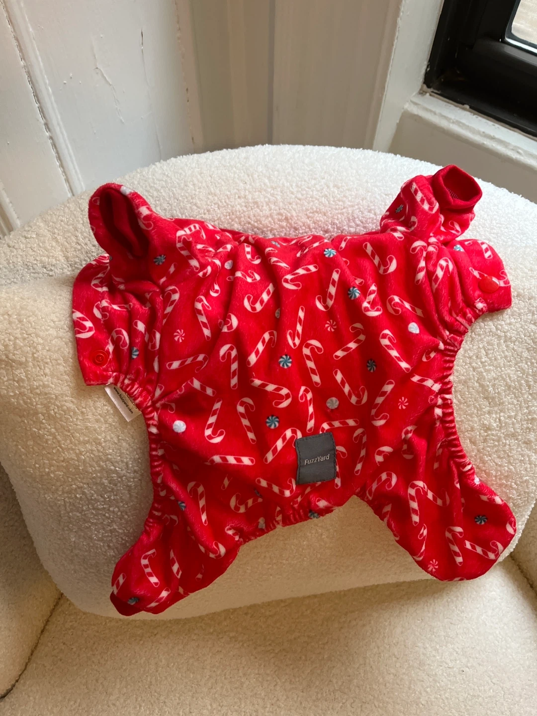 Two adorable dog Onesie outfit • features a candy cane print and the other features a nighttime moon and stars print. Soft, absorbent material. Machine washable.