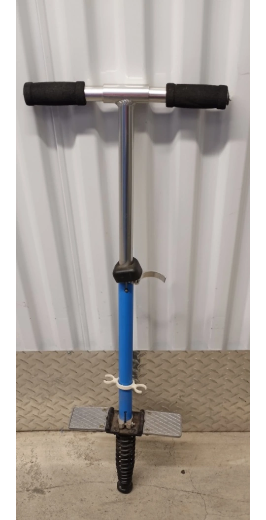 Aluminum pogo stick. Blue shaft, black foam grips.