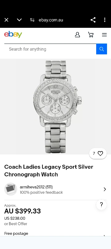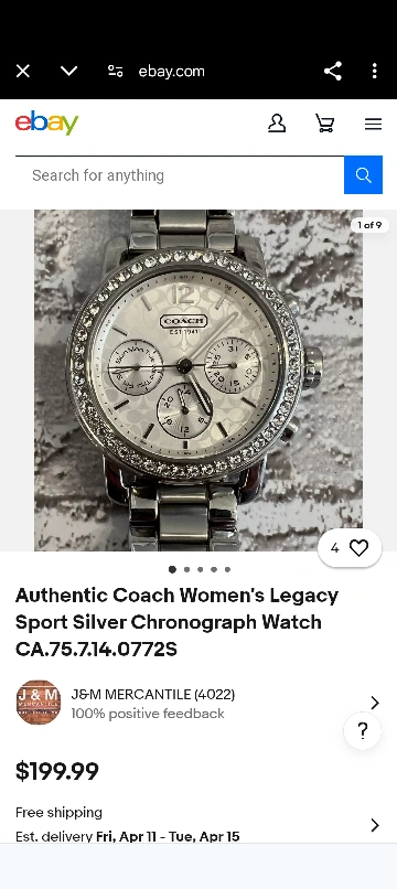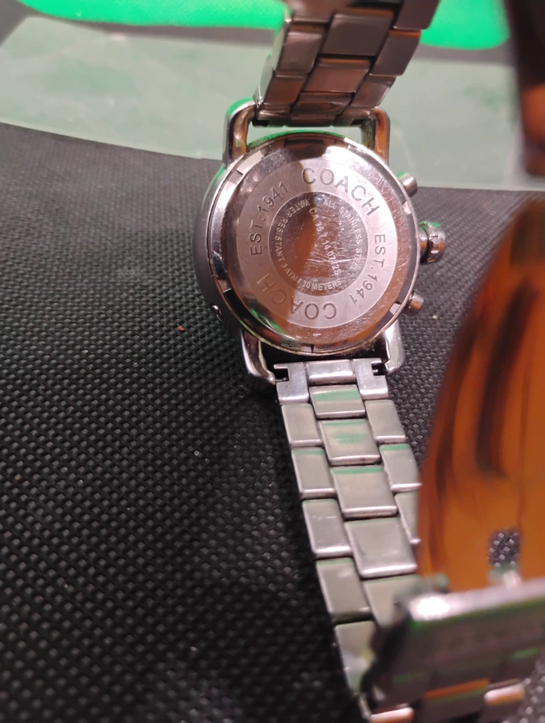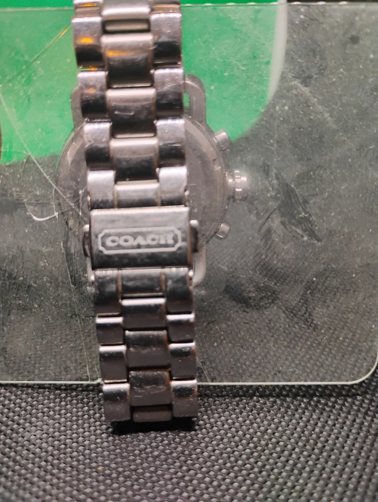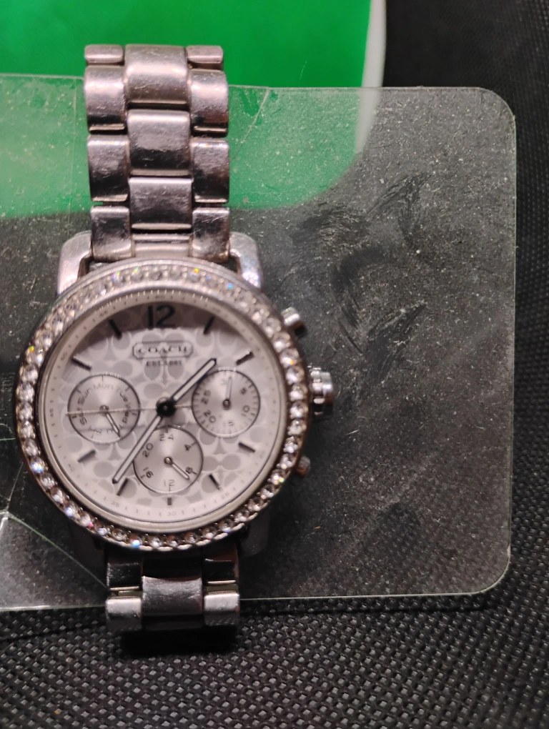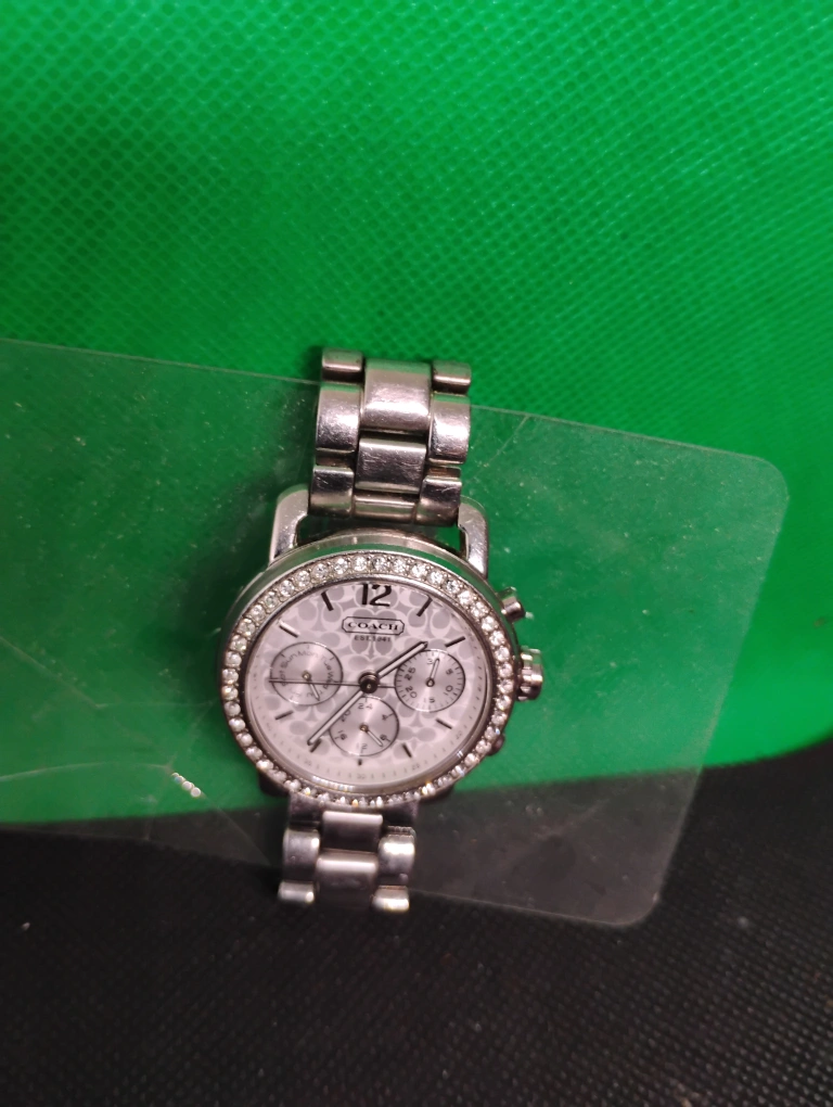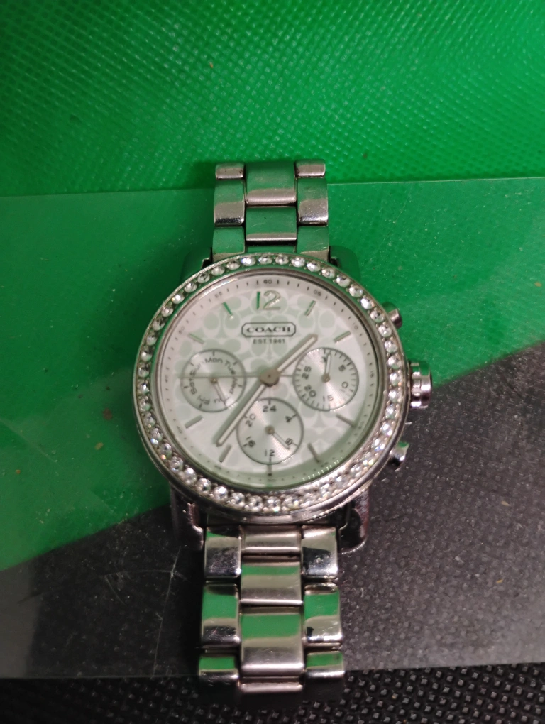 Silver-toned stainless steel Coach watch. Features a white face with crystal accents around the bezel. Chronograph functions. Metal band. used