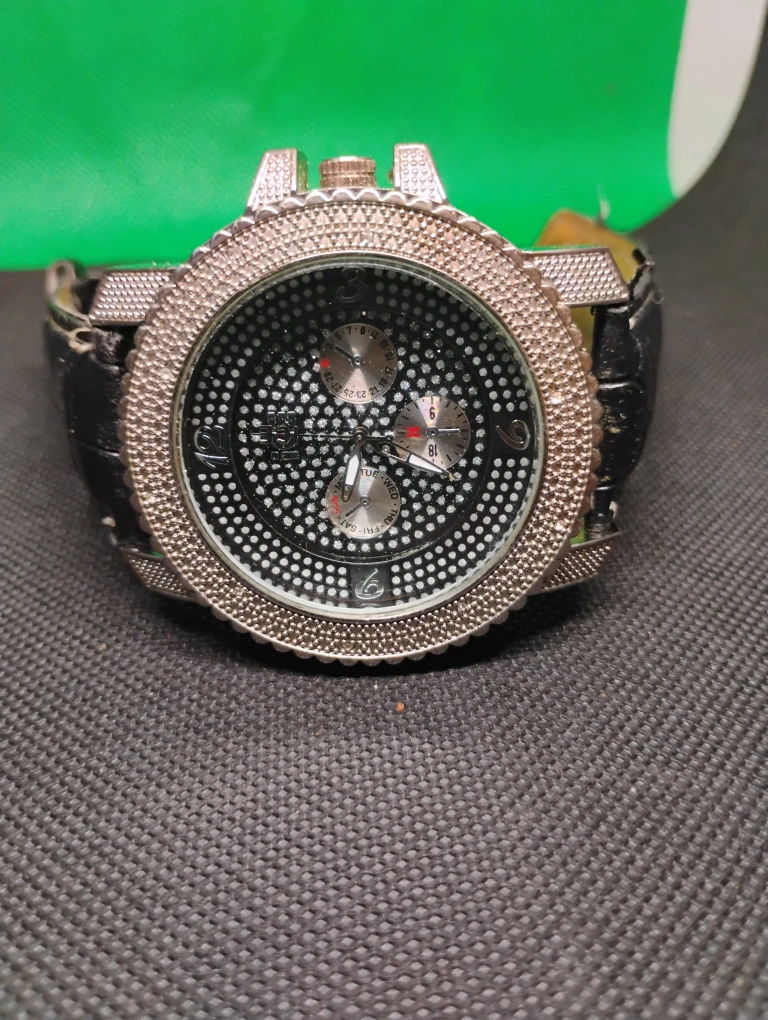 75Men's wristwatch. Black leather band. Silver-tone stainless steel case. Black face with crystals. Water-resistant. Japan movement. needs battery