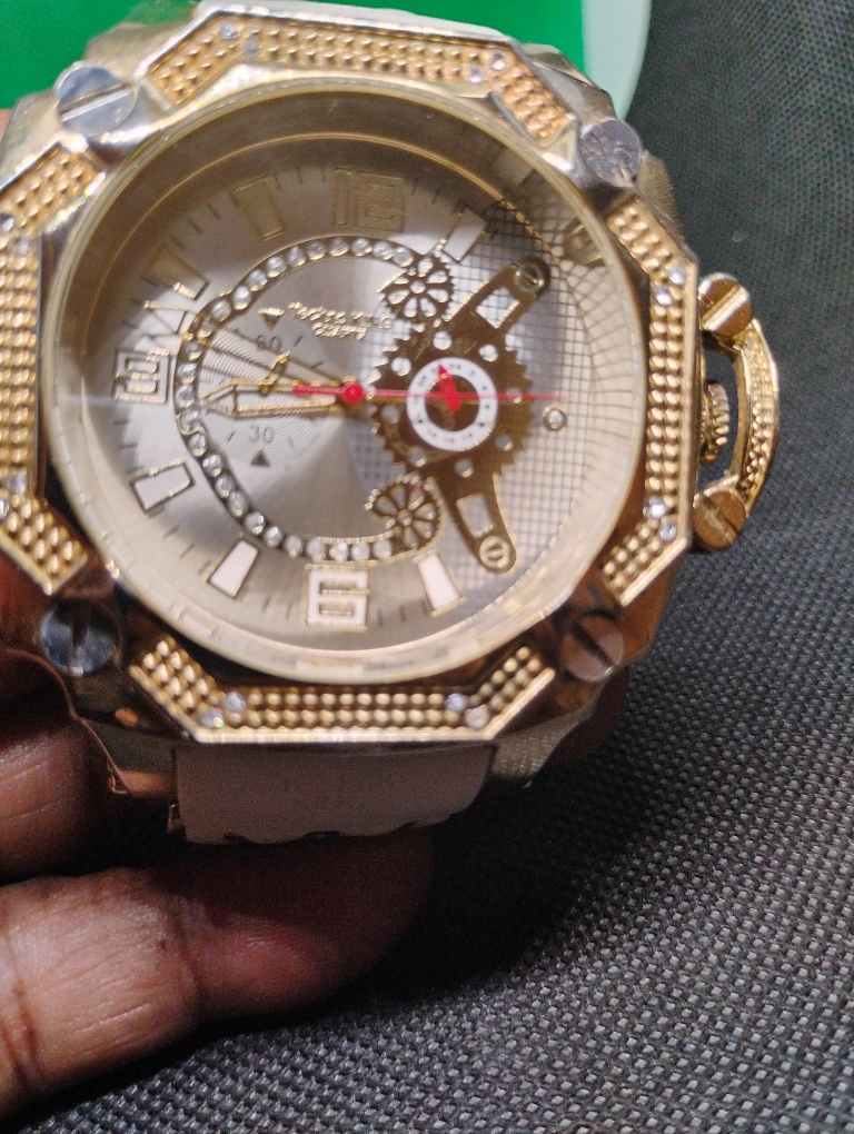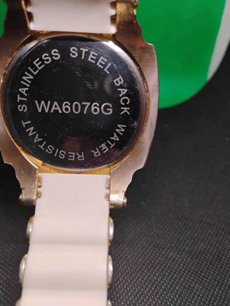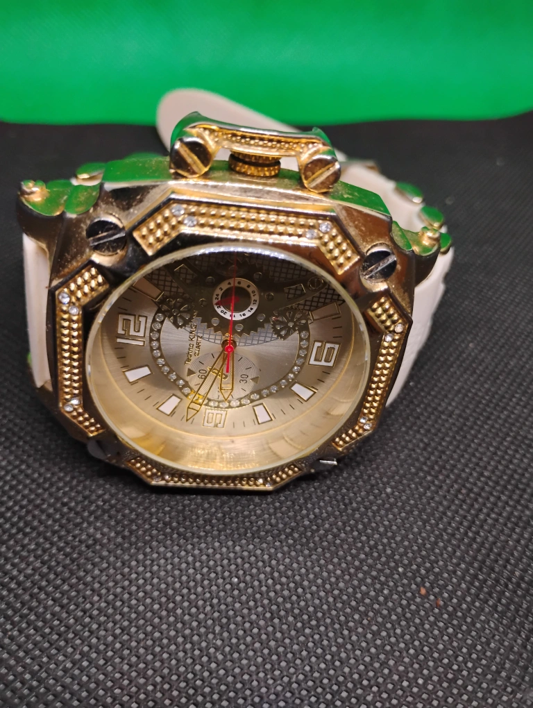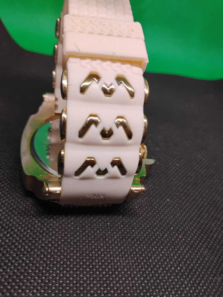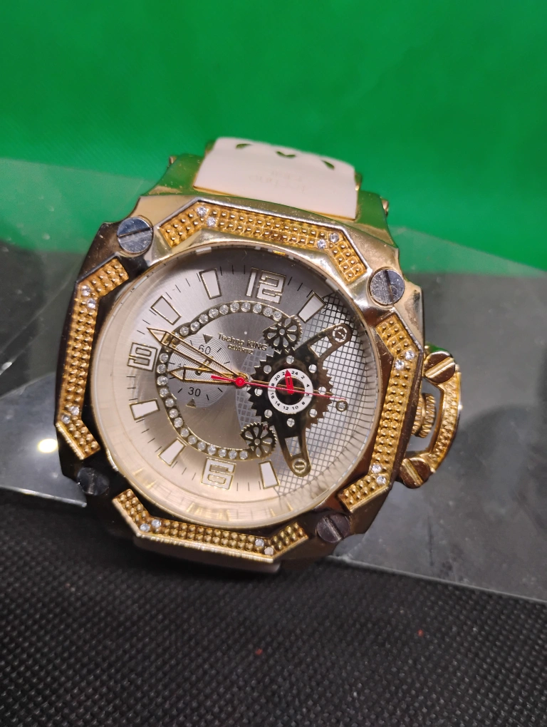 TechnoMarine wristwatch. Gold-tone stainless steel case and bezel. White silicone band. Crystal accents. Water-resistant. needs battery