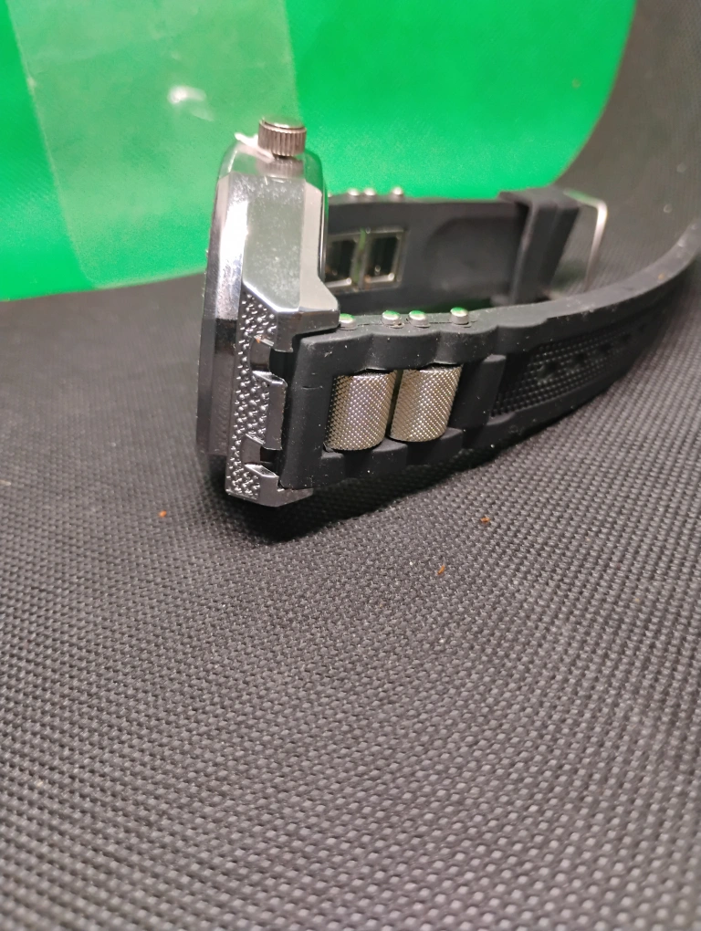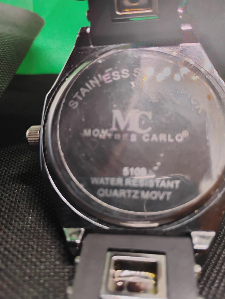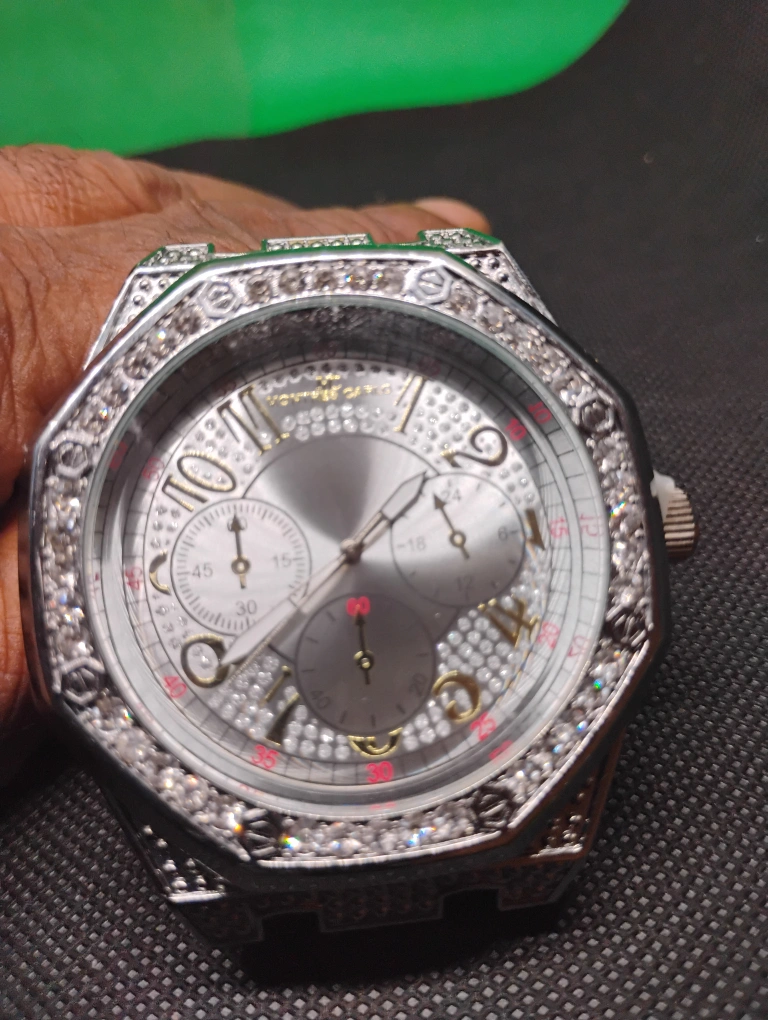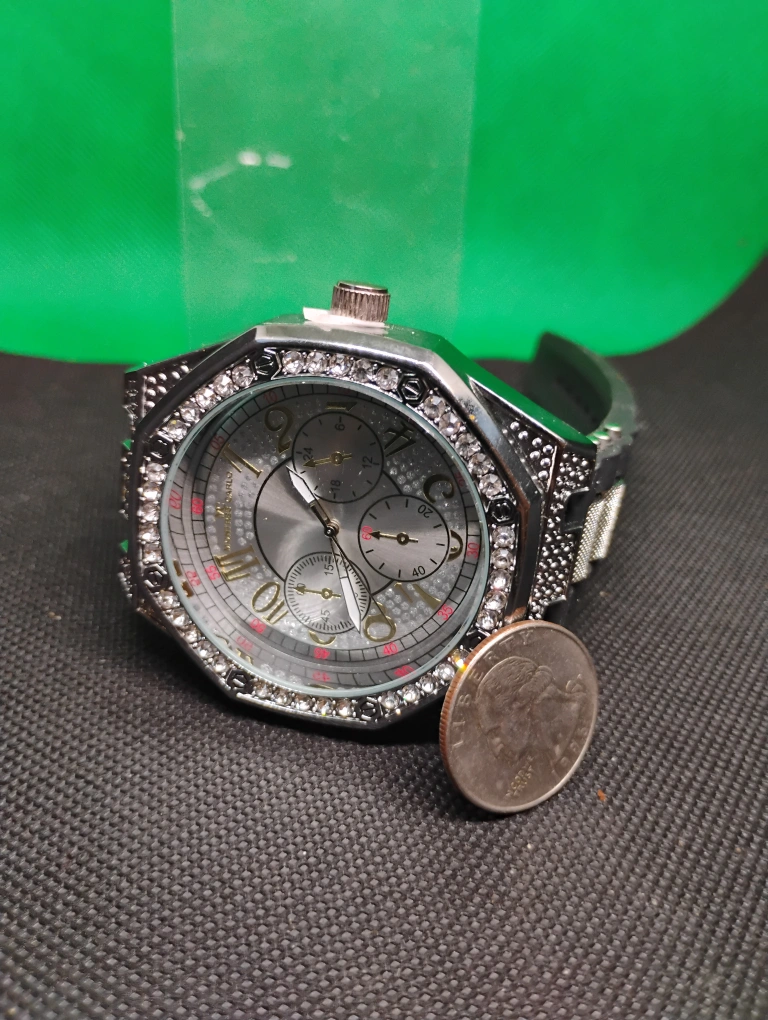 Octagonal face, silver-tone, studded with rhinestones. Black rubber band. Water resistant. Chronograph style. needs battery