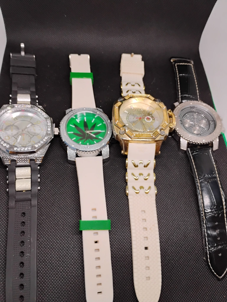 Set of four men's watches. Different styles and colors. Various band materials. Some have crystals. all 4 for 90