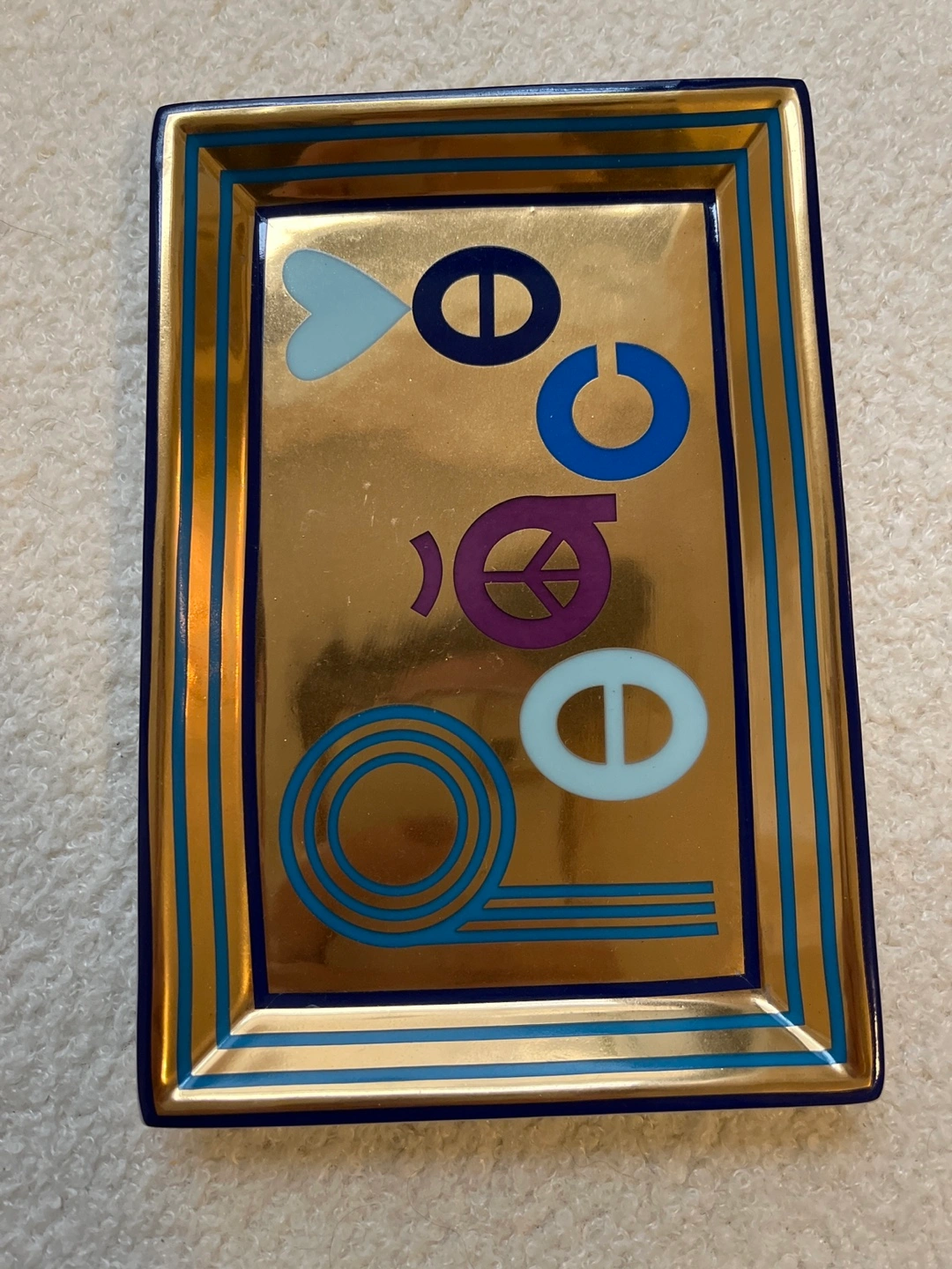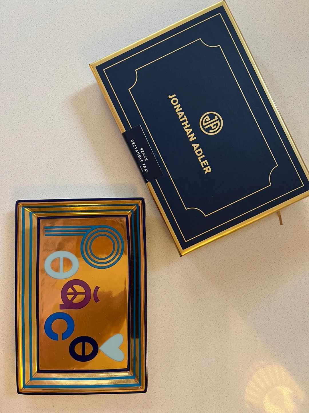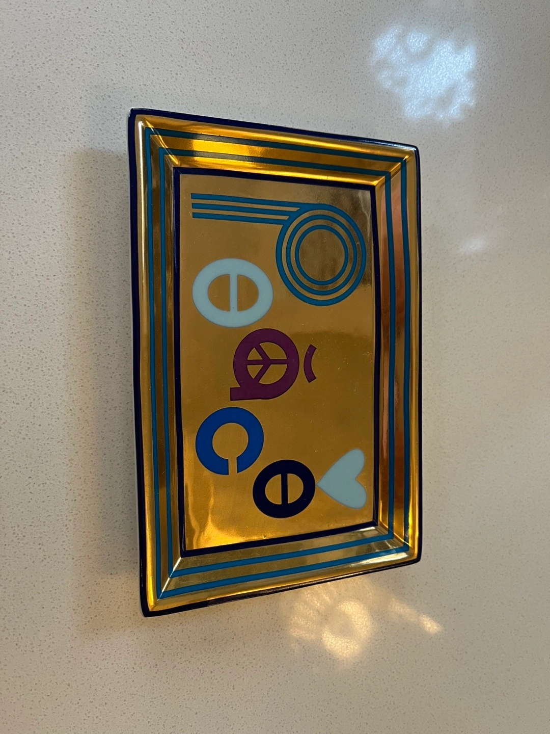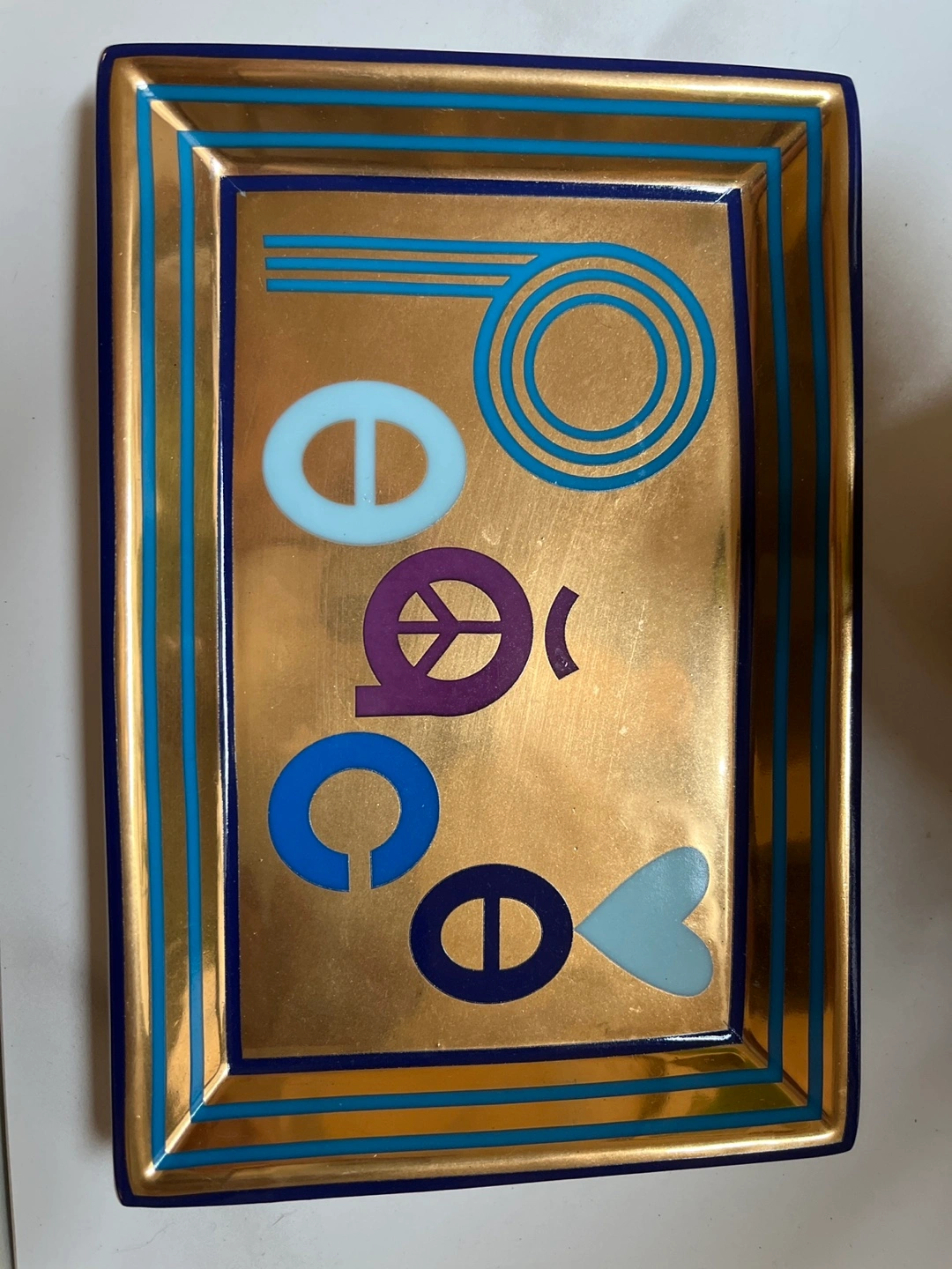 Rectangular “Peace” gold ceramic tray. Blue and gold trim. I also have the box it came in — great condition. It could be a gift!