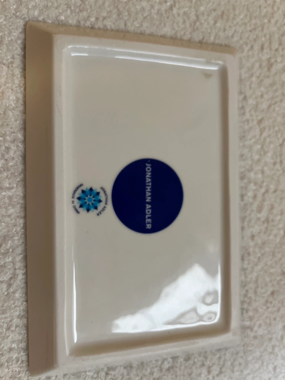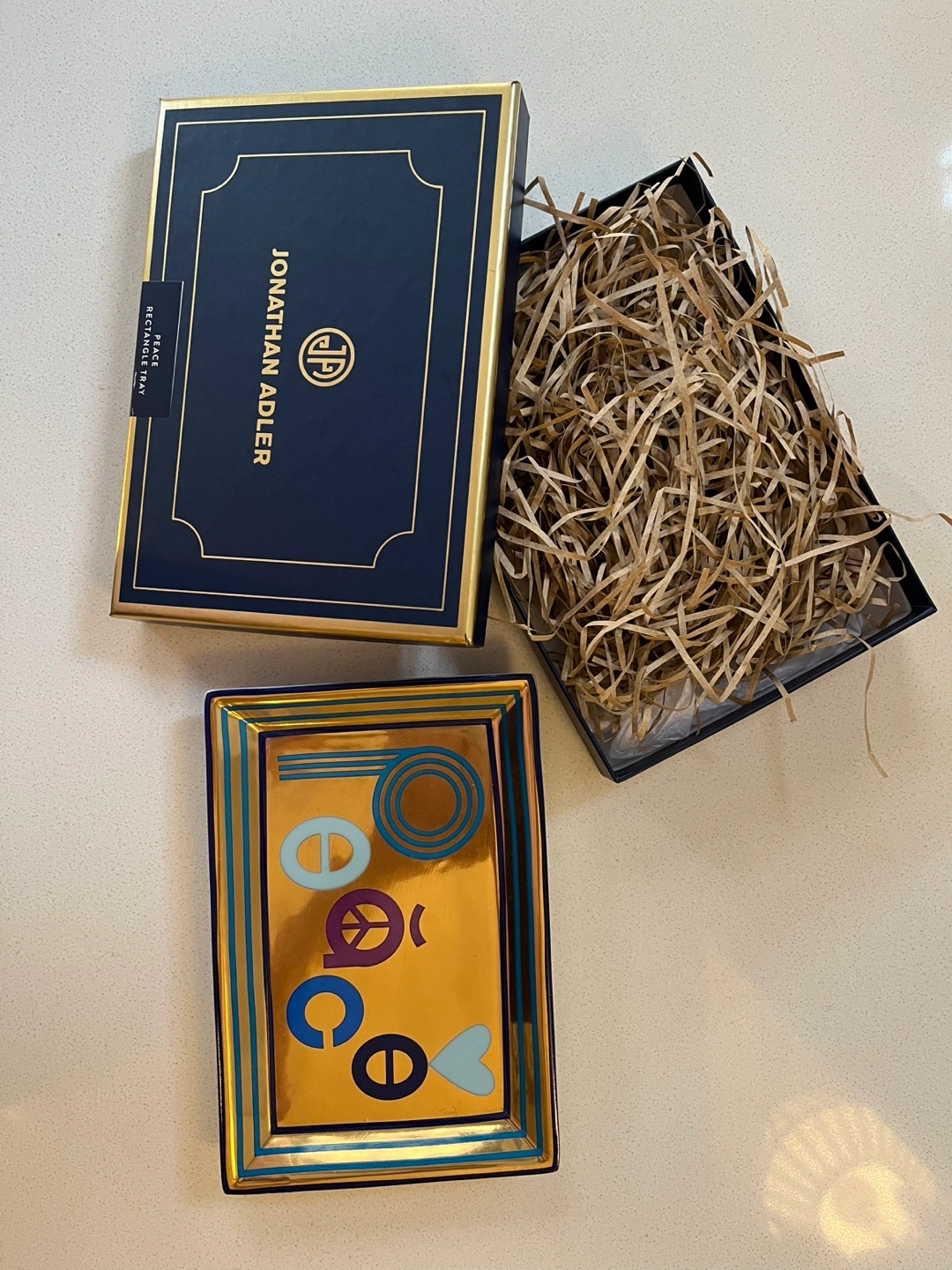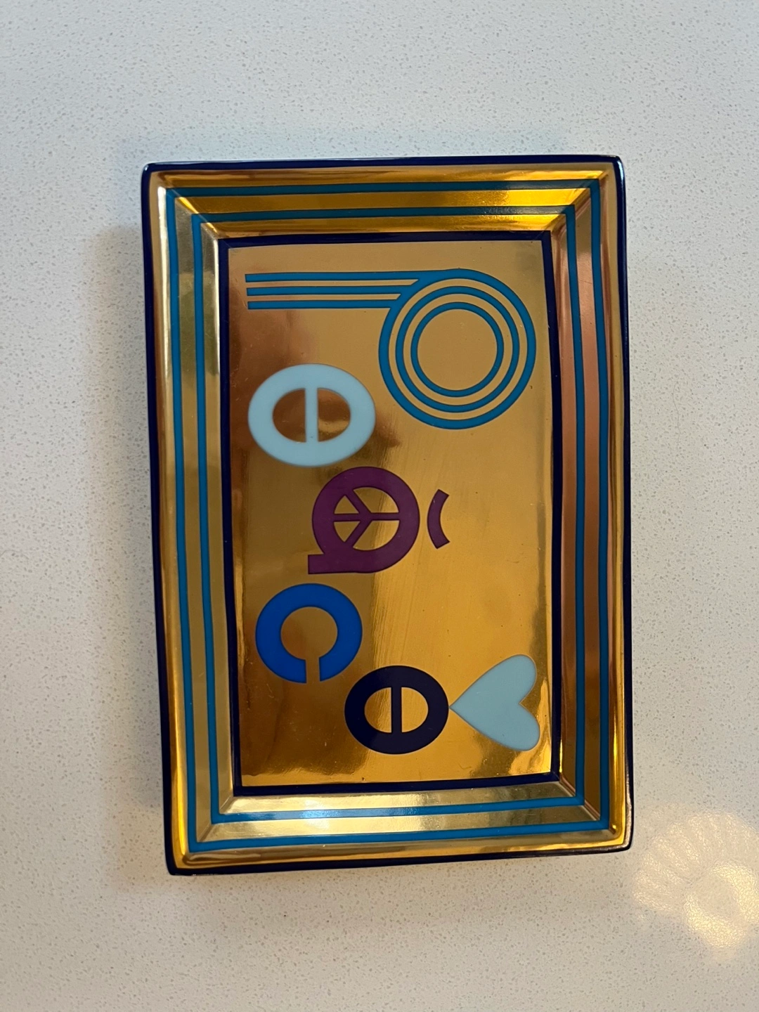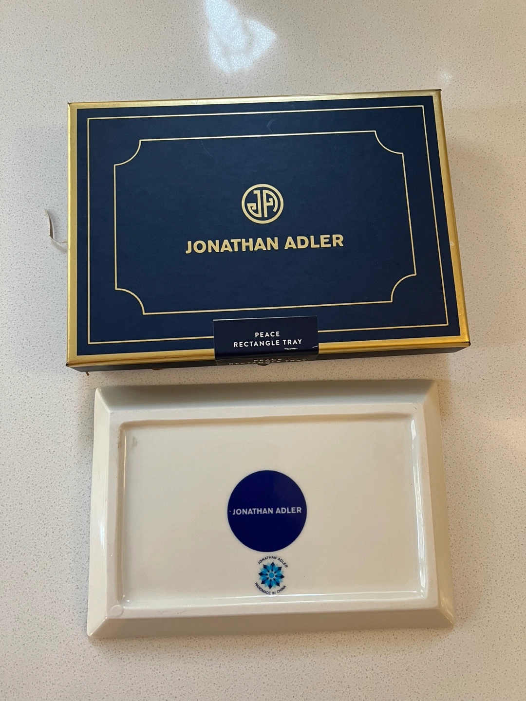 Rectangular “Peace” gold ceramic tray. Blue and gold trim. I also have the box it came in — great condition. It could be a gift!