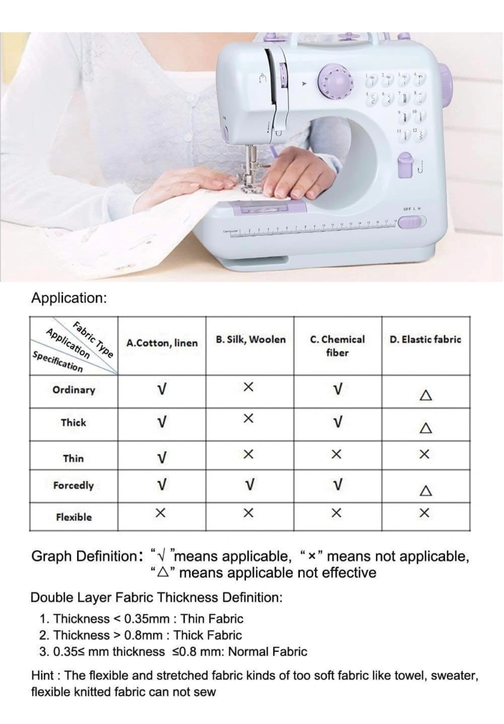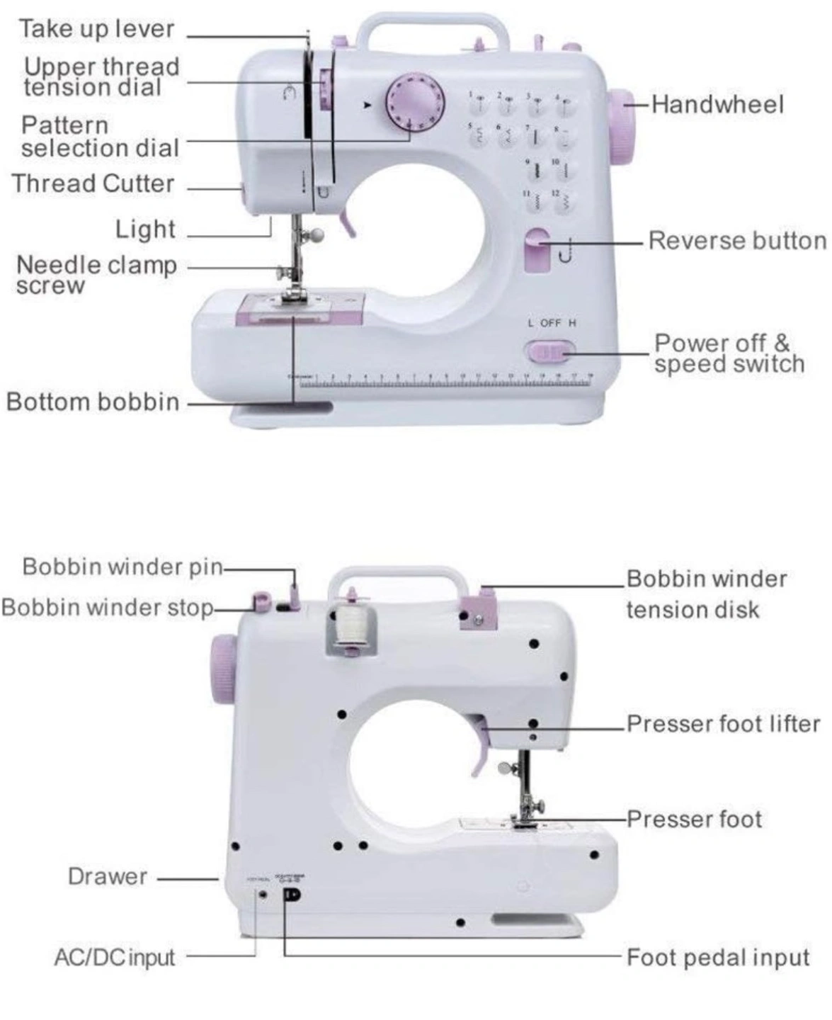 Portable household sewing machine. Features 12 built-in stitch patterns, two speeds, reverse sewing function, and adjustable needle distance. Includes a drawer for accessories. Great for sewing sleeves and overlocking.