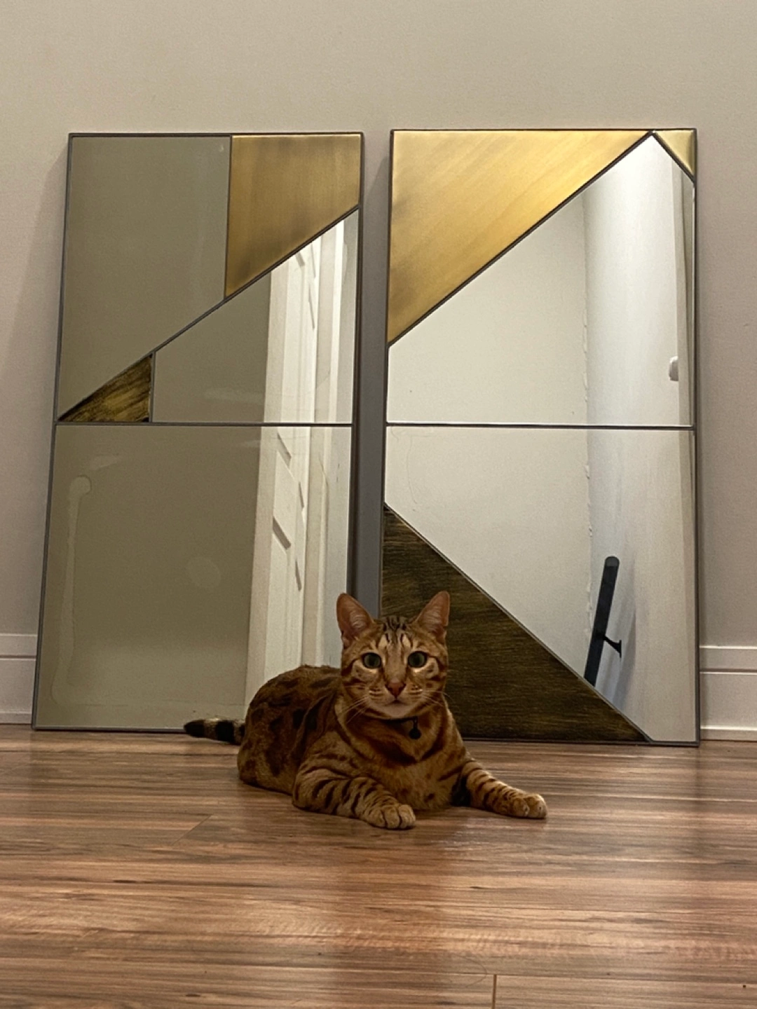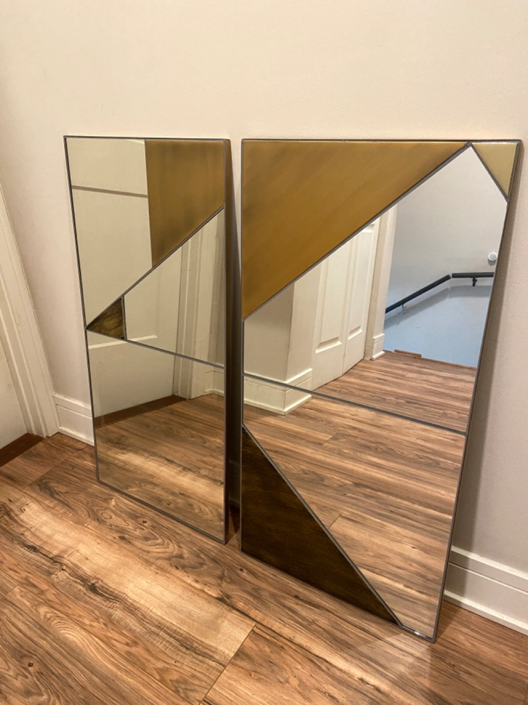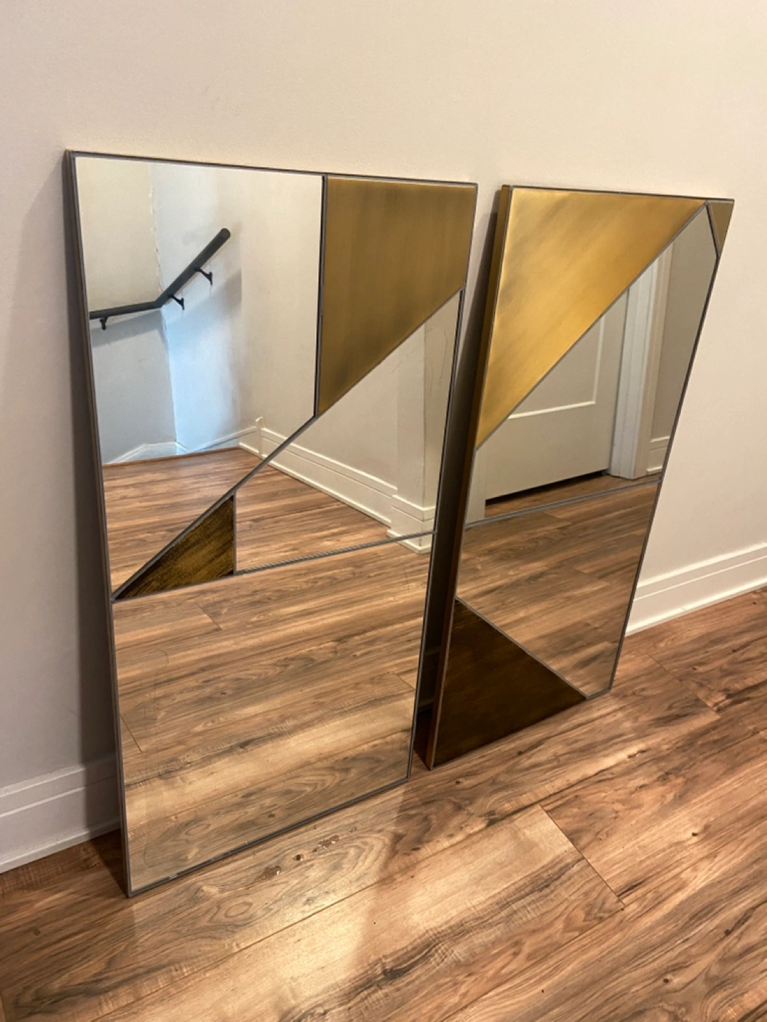 1000+Geometric wall mirrors. Gold and copper accents. Minor cosmetic damage in both mirrors with subtle dark smudges. 36"H x 18"W x 0.6"D. 22 lbs.