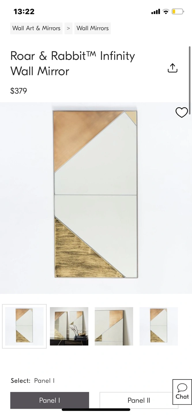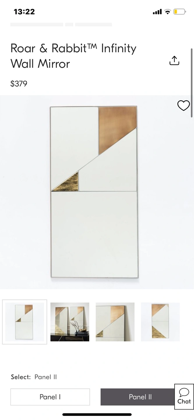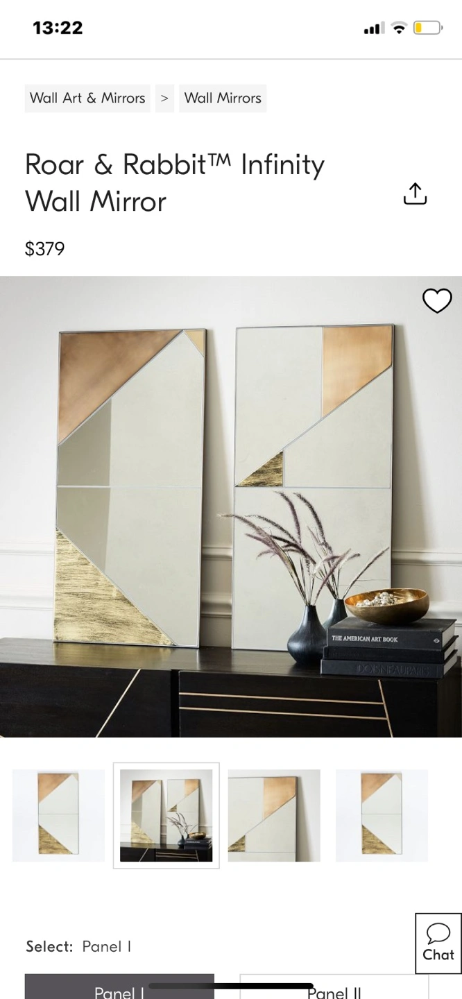 1000+Geometric wall mirrors. Gold and copper accents. Minor cosmetic damage in both mirrors with subtle dark smudges. 36"H x 18"W x 0.6"D. 22 lbs.