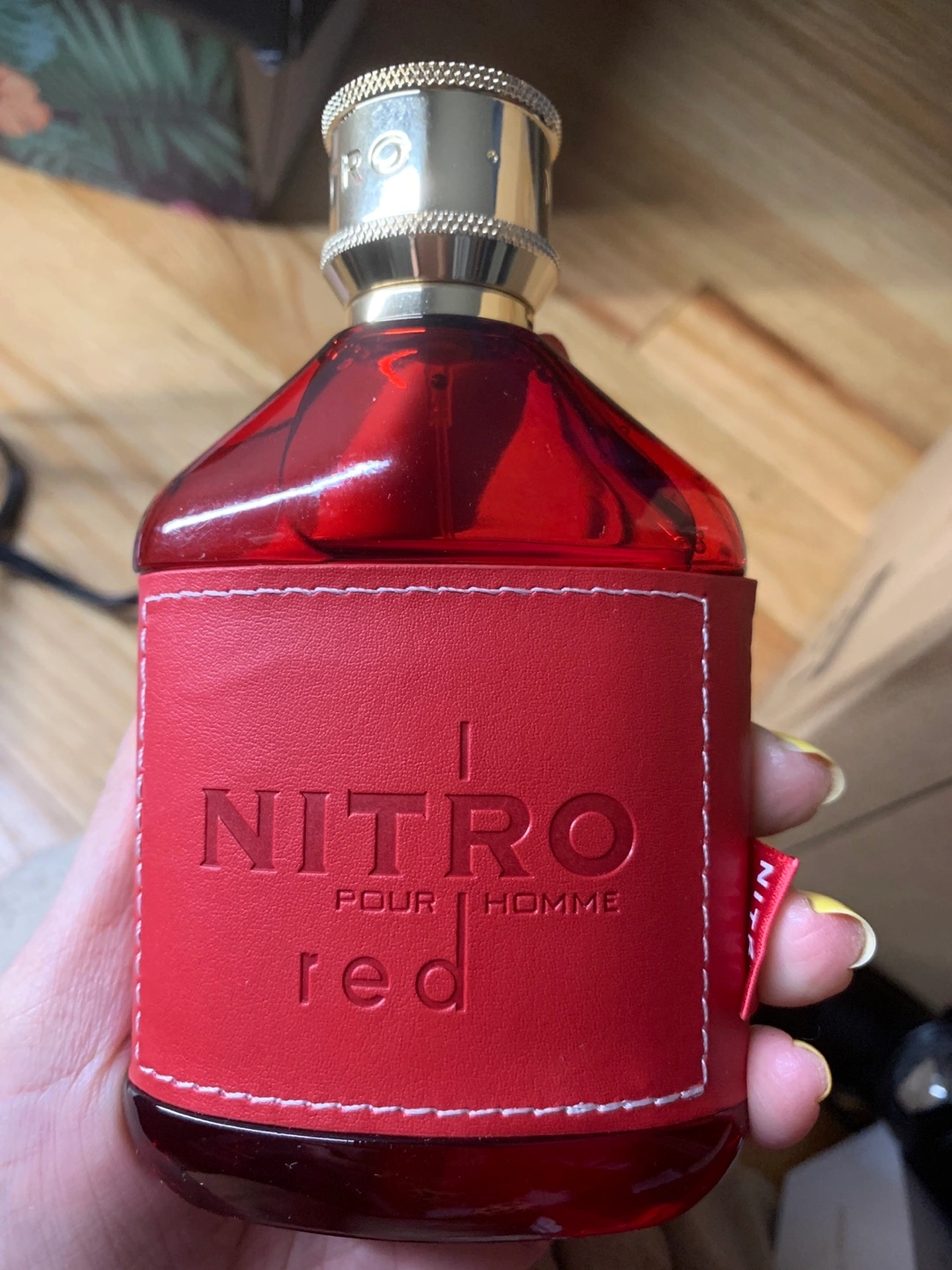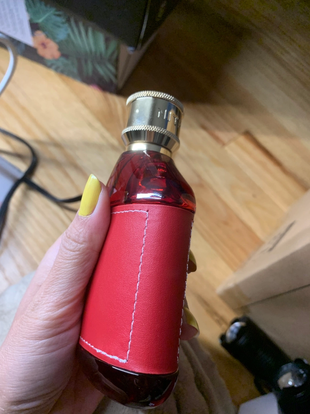 275100ml Eau De Parfum spray. Red bottle with leather-like cover. Gold accents. Men's fragrance.