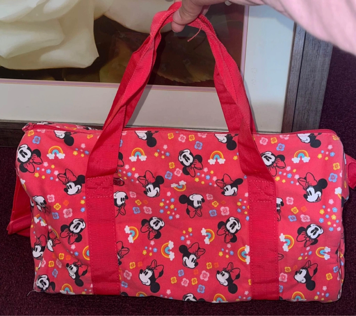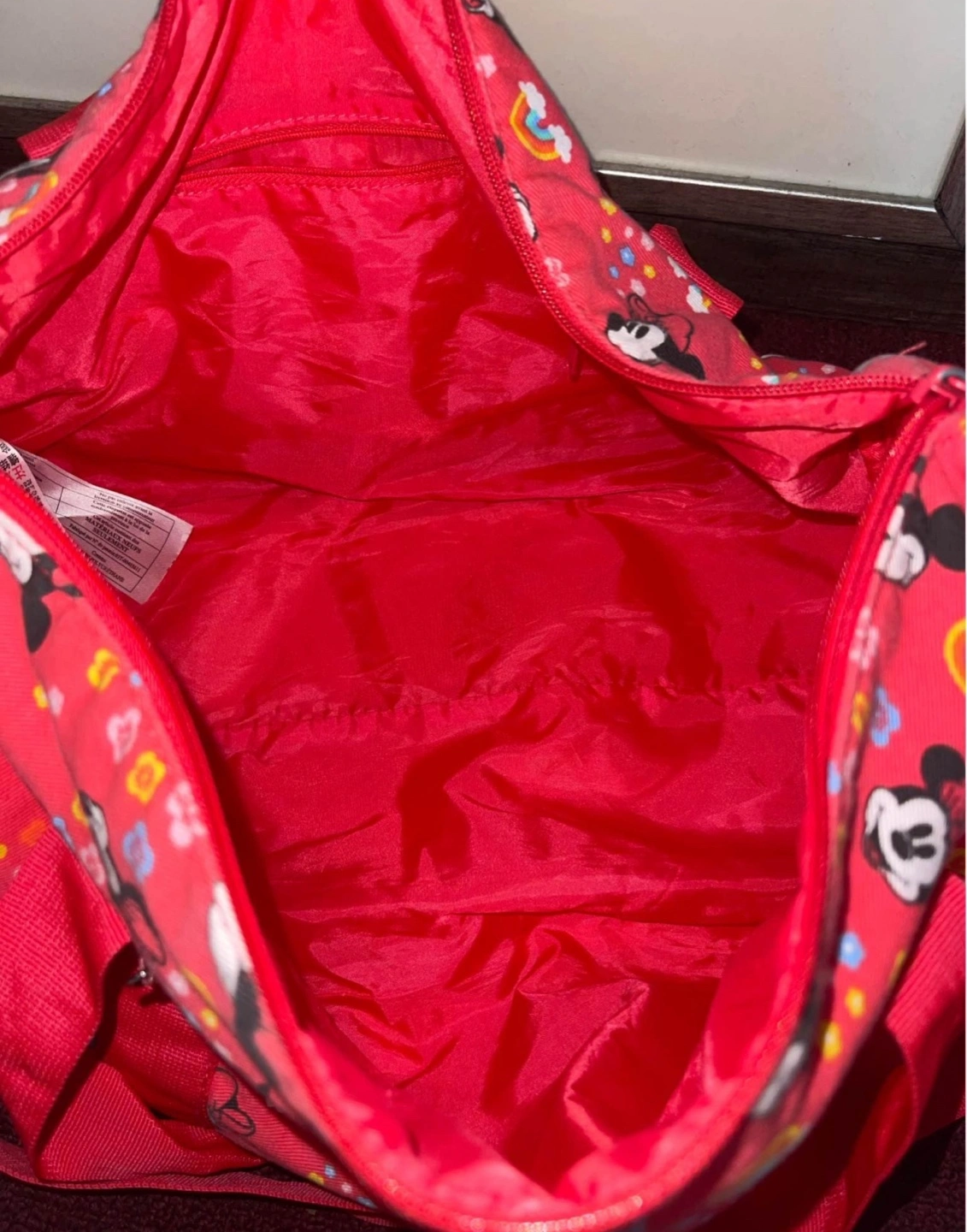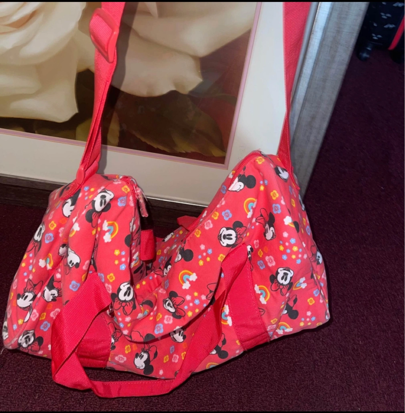 Adorable Minnie Mouse duffel bag. Pink with Minnie Mouse and rainbow pattern. Perfect for kids. Features a main compartment and top handles. This stylish bag is on point. Perfect for ballet class or any adventure, this soft, zip-top duffel-style ballet bag featuring an allover print of Minnie's face, also has top carry handles and an adjustable shoulder strap for on-the-go convenience. Need gone asap There is some wear so please look at the photos!