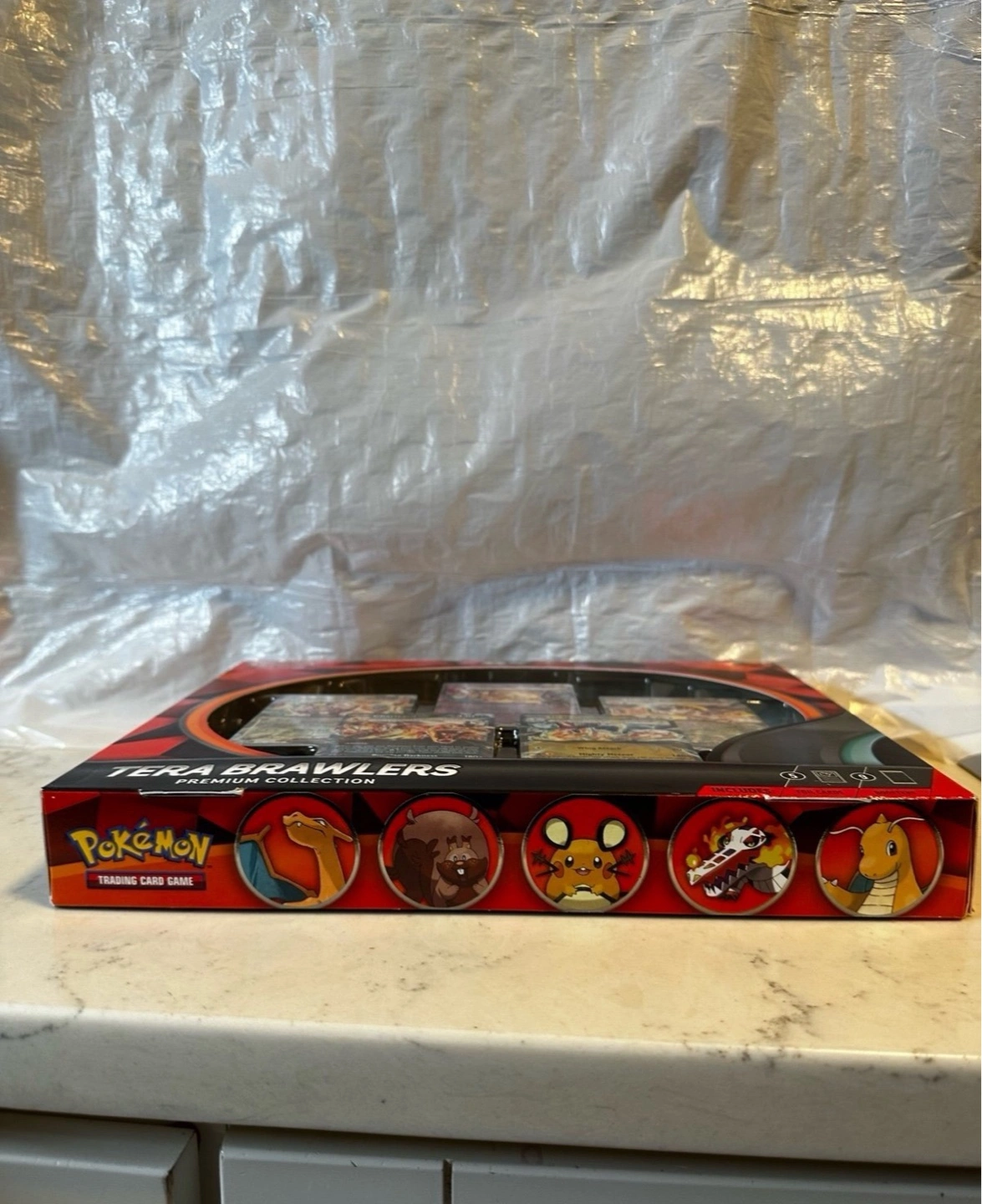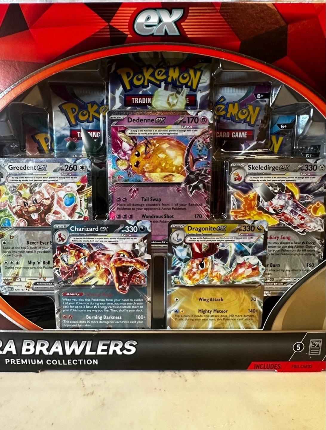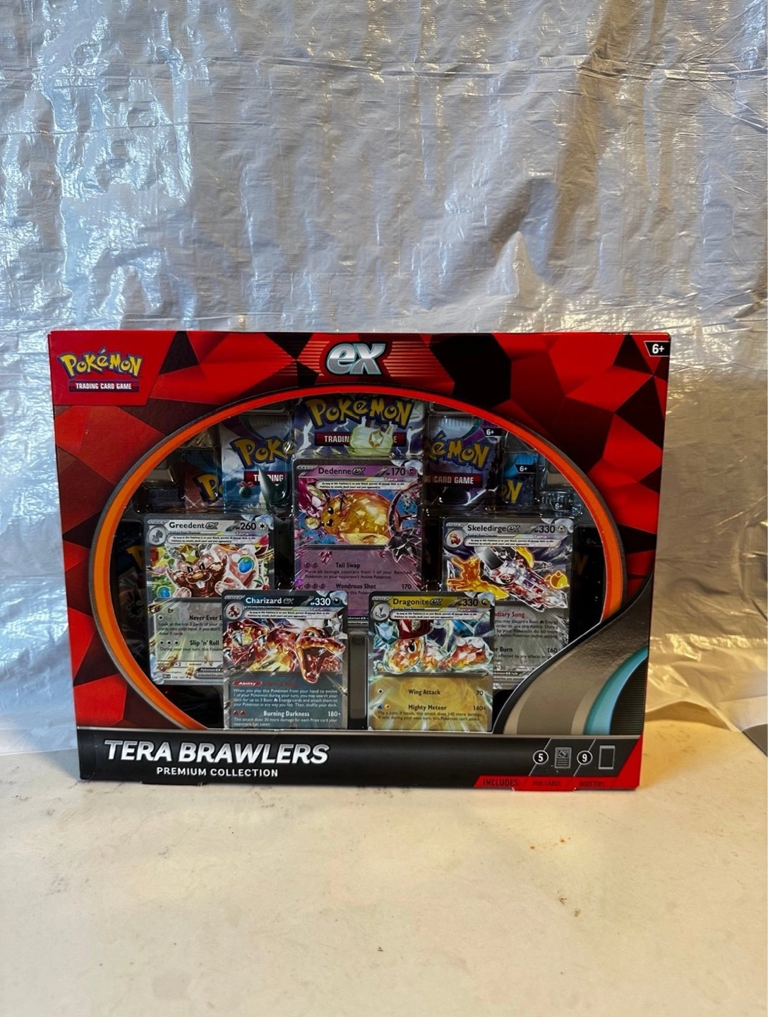 Sealed Pokemon Trading Card Game Tera Brawler Premium Collection. Includes 5 booster packs and multiple cards featuring Charizard, Dragonite, and more.