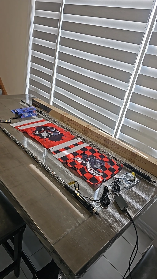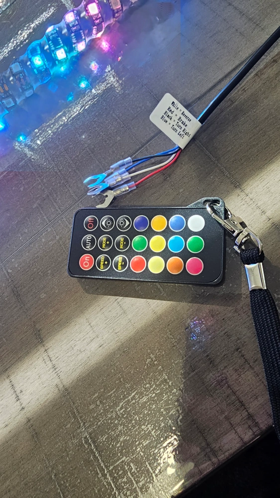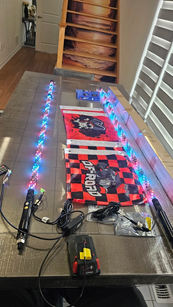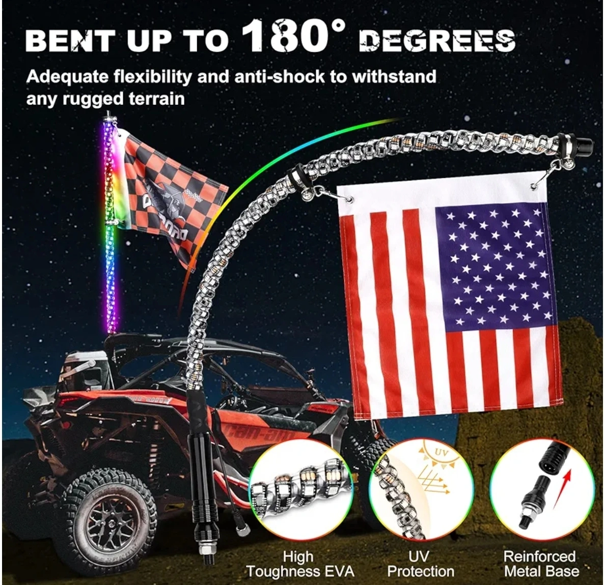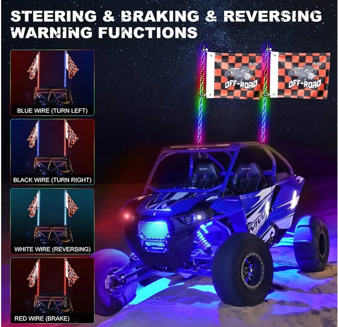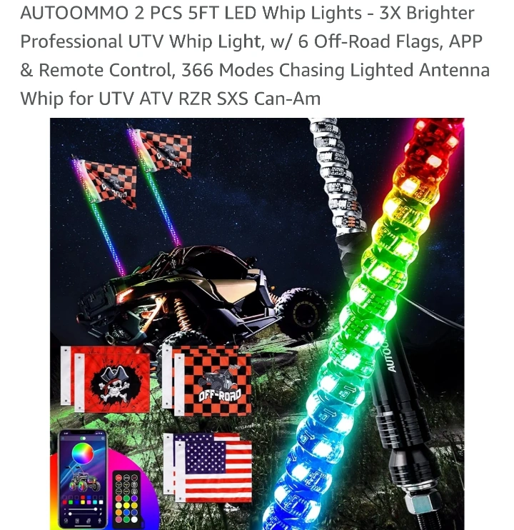 Two 5ft AUTOOMMO RGB LED whip lights. Includes six off-road flags, remote control, and app control. 366 chasing light modes. As well integrates with your signal, reverse and brake like of your vehicle
