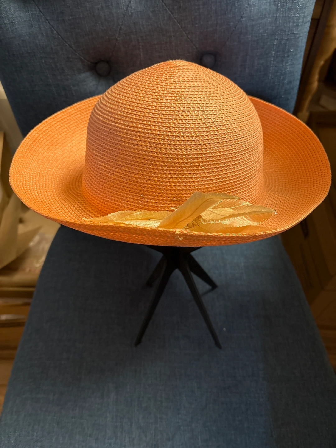 Women's summer hat. Peach color. Wide brim. Raffia material. Removable gold ribbon accent.