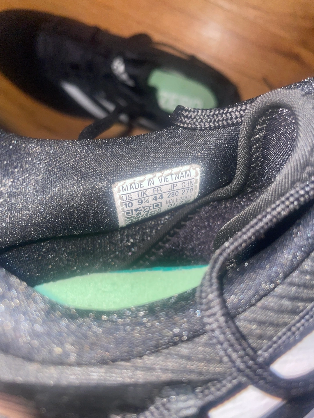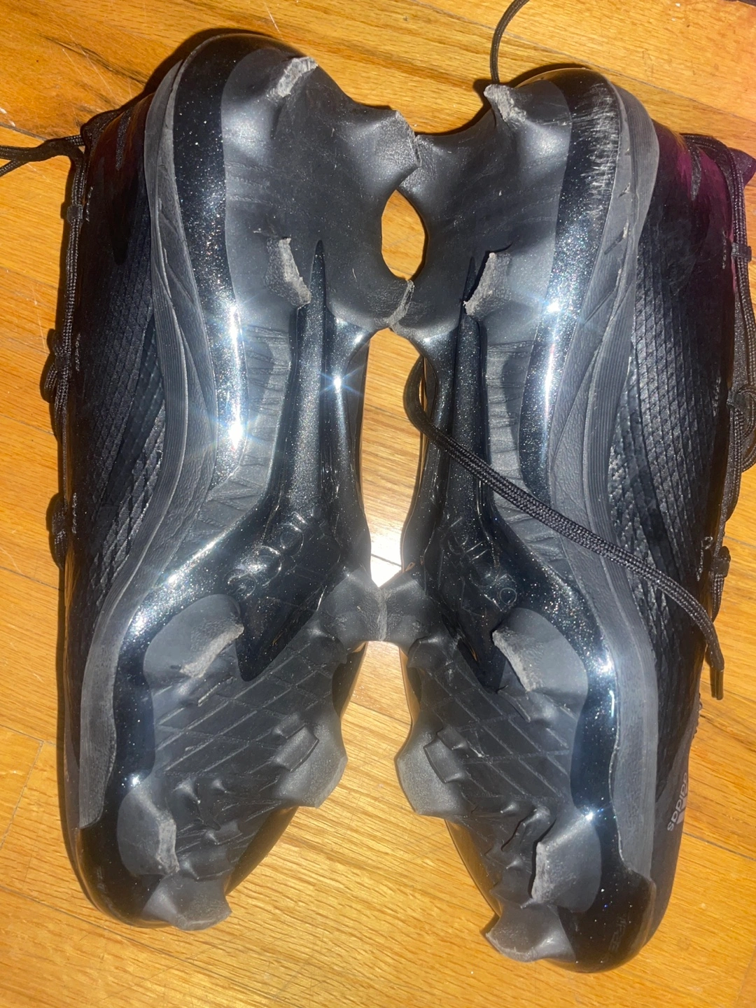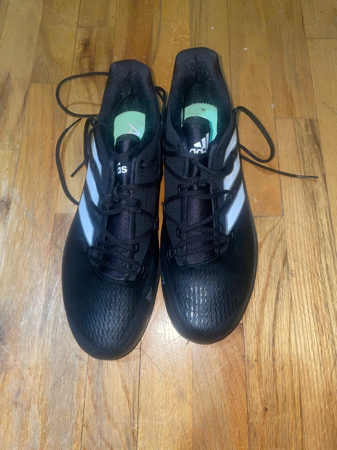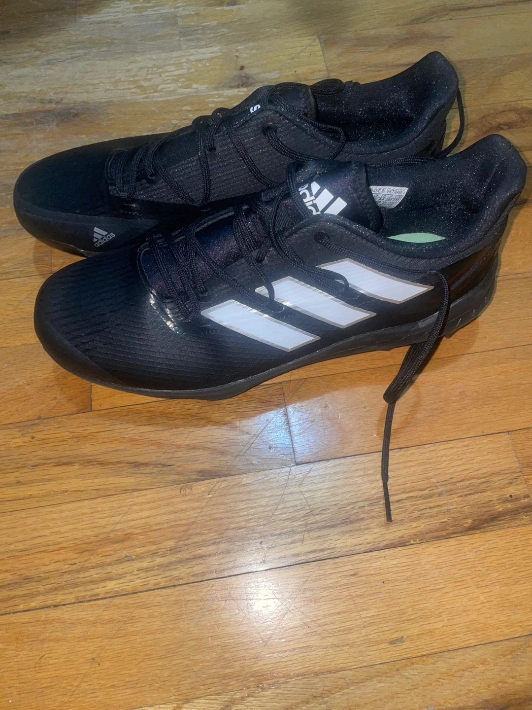 Men's Adidas baseball cleats. Size 10. Black with white stripes. Made in Vietnam. Some wear and tear on cleats.