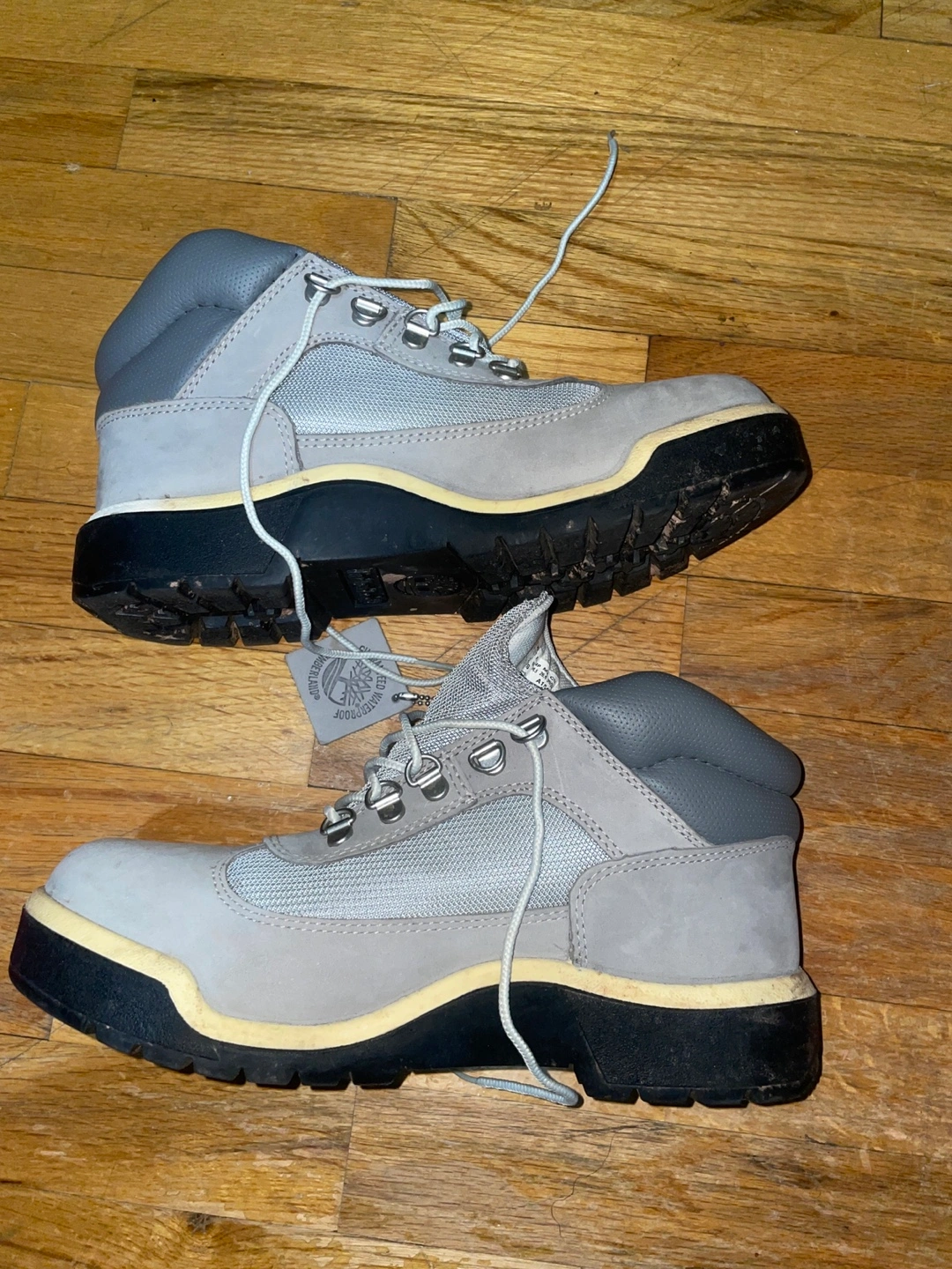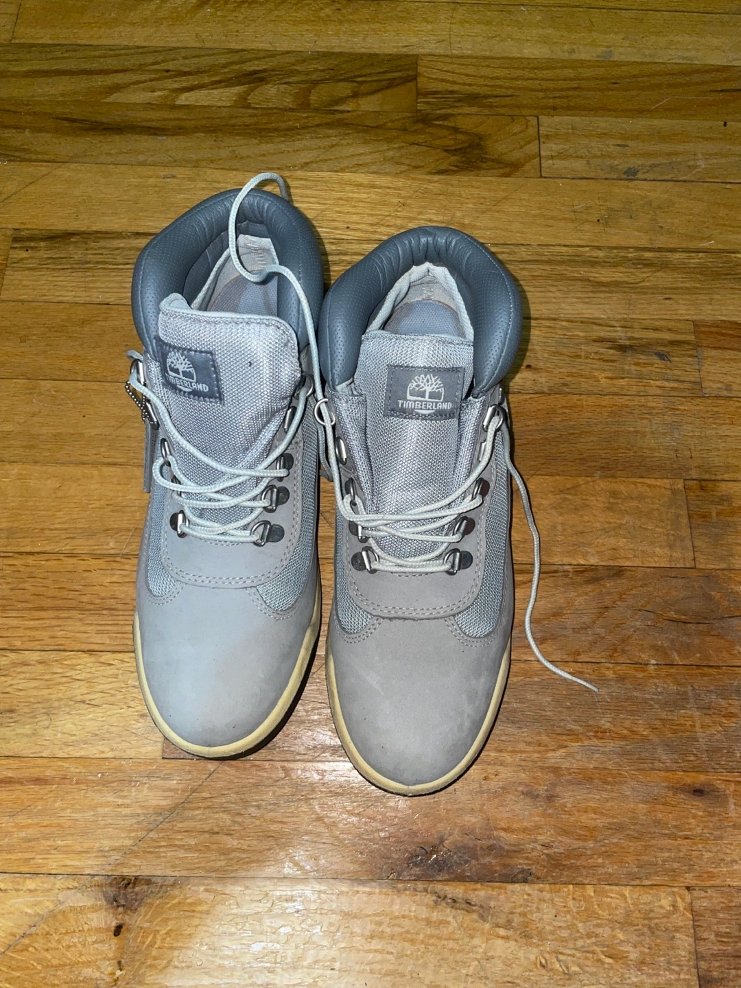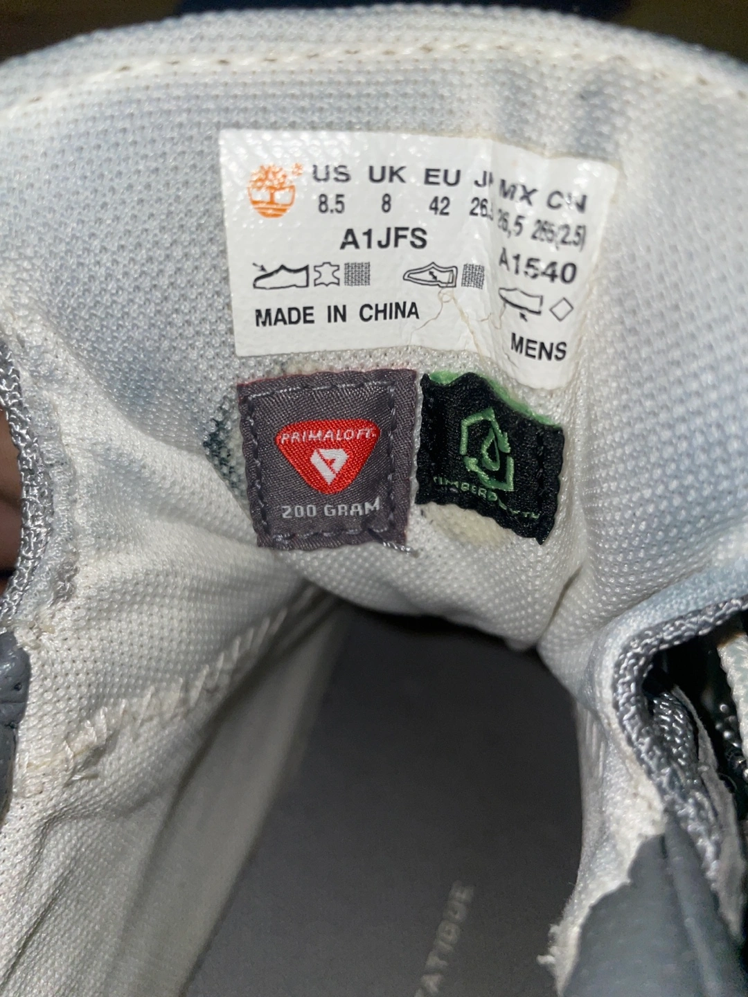 Gray suede and mesh Timberland hiking boots. Men's size 8.5. Made in China. Primaloft 200 gram insulation. Slightly worn.